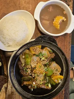 放工同老公喺北角想搵啲平靚正嘢食試咗森森食堂,結果真係幾有驚喜!唔使 80 蚊 就有 炸鱈魚 + 牛柳頭扒,仲包埋 炸素魷魚圈同薯條,真心抵到爆,炸鱈魚外皮脆脆地,魚肉唔乾唔鞋,幾好食下,外面都唔太多見。而牛柳頭扒夠 juicy,啖啖肉唔韌,呢個價錢算好交到功課,配埋素魷魚圈都唔差,至小口感都有做到,另外薯條炸得啱啱好,乾身又夠脆,幾啱我口味。另外我哋仲叫咗 A1 蒜茸牛仔骨煲,呢個都係OK!份量真係超大碗,有成 6–7 件牛仔骨,每塊都大大塊,望落已經覺得抵。牛仔骨入哂味,啖啖肉,而且啲肉質唔韌,帶少少油香食落更香口,幾開胃下~加$13 仲有飯同湯,一個人食真係超級夠飽又抵食!整體嚟講,森森食堂真係 CP 值高,又平又飽又唔伏!