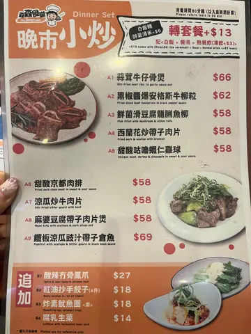 經常往北角探望家人,都會路過這裏,今晚時間尚早,便來到這裏一試。自選系列,迷你鮮茄焗豬扒飯、雜菜沙律、鮮菌芝士焗西蘭花。$63另加凍檸樂$6。迷你鮮茄焗豬扒飯,茄汁味道十足,飯底經過蛋炒香之後,加上豬扒炸香過,更加吸收了茄汁的味道。這個焗豬扒飯雖然是迷你版,不過已經夠一個人享用。雜菜沙律,胡麻醬份量十足,帶起了蔬菜的鮮味。鮮菌芝士焗西蘭花,芝士味道香濃,膠漿西蘭花,軟硬適中,感覺健康。晚餐A鐵板煎雞扒拼巴西豬扒$72 ,配意粉生蒜汁及羅宋湯$72,仙草奶茶跟餐$6。鐵板煎雞扒拼巴西豬扒,雞扒和豬扒煎得剛剛好,外脆內軟,加點蒜蓉汁,更加惹味可口。蒜蓉汁流在雞扒和豬扒上,鐵板的聲音吱吱聲,好有香港鐵板特色。羅宋湯,材料很多,酸酸甜甜,味道十足。仙草奶茶,奶茶味道香濃,加上仙草的彈牙,很有台灣特色。芒果布甸$10,芒果和奶味道適中,不會過甜。