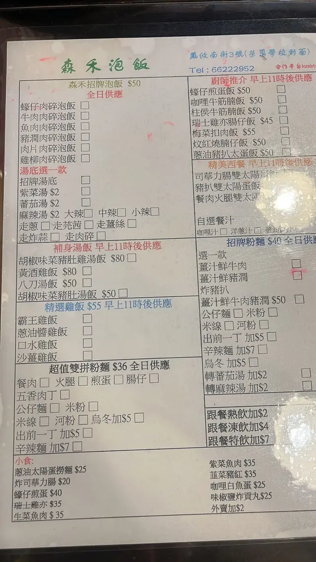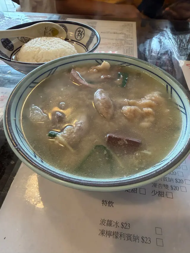 前排見元朗谷友力推森禾泡飯個蠔仔飯,bookmark左都未黎試,是晚正苦惱緊食咩好,諗起呢間泡飯,就黎試試吧😋小店只有四張枱,繁忙時段一位難求。餐牌除左泡飯,仲有唔少客飯、快餐等,價錢相當親民。學生餐仲三十蚊起,簡直係平到笑,點解我當年做學生個陣無呢啲抵食小店嘅?😂⭐蠔仔肉碎泡飯點了大熱嘅蠔仔肉碎泡飯加紫菜,賣相真係唔錯,蠔仔粒粒肥美飽滿,份量仲下得唔少,湯底係大地魚湯,加埋蠔仔認真鮮味,成碗食晒湯都無淨㗎,正😍⭐胡椒味菜豬肚雞湯飯另外仲叫左胡椒豬肚雞湯飯,湯飯個白飯係分開上嘅,份量仲大碗呀😳胡椒味菜豬肚雞滿滿一大碗,雞件鹹鮮,豬肚煮得淋身入味,個湯勁濃胡椒味,香香辣辣飲完出一身汗好舒服😝咁好味梗係一滴都飲晒啦!⭐瑞士雞翼仲加左份小食瑞士雞翼,一份有四隻,炆得軟腍入味,一咬就骨肉分離🤪連啲骨都入哂味。⭐凍鴛鴦 & ⭐凍檸賓跟飯熱餐飲加$2,凍飲$4,呢個價位合理吖。飲品大大杯夠冰凍,食完熱辣辣湯飯飲杯凍野確係爽😆哈哈,店員啲字好工整,一睇就知點左咩食😝…查看更多