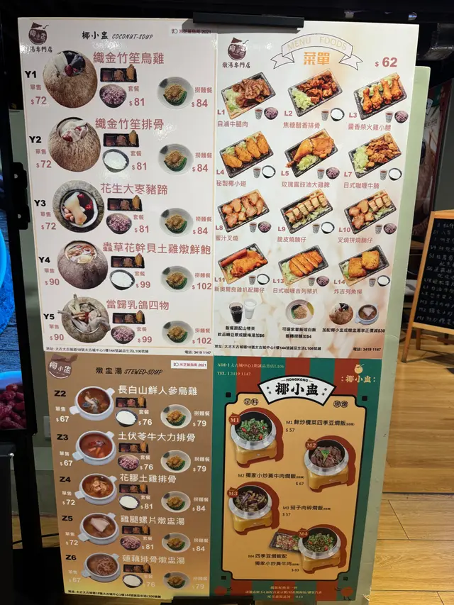 今日同老公去太古城搵嘢食,唔打唔撞發現咗一間唔太起眼嘅小店。聽聞呢間小店《椰小盅燉湯專門店》好出名,餐牌上每個湯都有註明功效,非常細心,賣點係椰小盅,故明思意係用原個椰子原盅燉湯,好處係燉出黎既湯好香甜的椰子味。雖然座位唔算多,店舖較細,似街坊小店,簡約的環境,尚算舒適,衛生就一般,採取自助形式,買完飛要等一段時間才有食物出品,平日午市過後前來,人流不少,吃到一半就見到外面已經好多人在排隊。一個餐有齊靚湯,主食同甜品,真係一次過滿足曬三個願望。食物送到,原個椰子上,一打開蓋已經有滿滿的椰香味,材料蠻多,湯及湯料放滿了整個椰子,不過主食就有啲失色,味道都唔算太差嘅!已簡便的湯品餐點,它的價格,總的來說還不錯,必試椰子盅嘅燉湯,湯清得嚟真係好重椰子味。查看更多