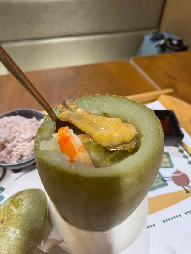 近排缺乏湯水,想飲番D湯清熱吓就突登去咗太古試品入面嘅椰小蛊叫番個八寶冬瓜湯清熱下先。 冬瓜原個上菜,入面材料滿滿,有雞髀肉,蝦,蟹柳同埋個瓜仲有好多肉比你刮出來食。 飲完湯已經好滿足另外個餐仲有碗健康番薯飯,甜甜地夾住D紅米飯一齊食感覺軟糯,前菜就有一隻滷水雞翼同菜甫。 這餐完全冇味精健康非常查看更多