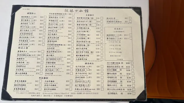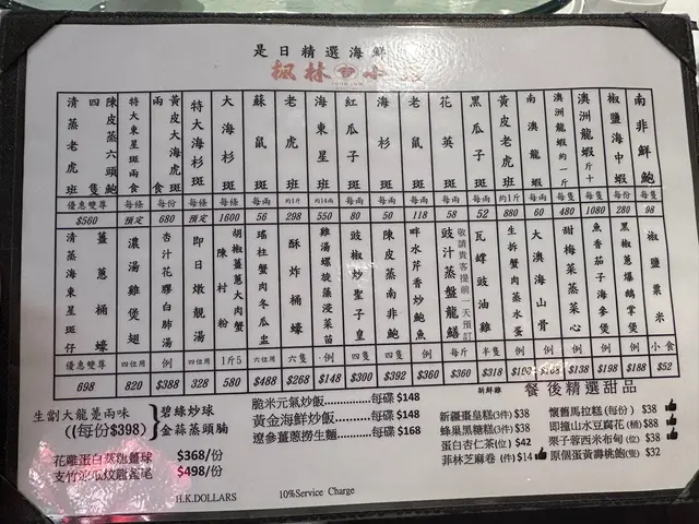 今次再去食中菜.依間餐廳嘅食物味道同質素真心唔錯.百花蜂巢豆腐 (HK$98)係我最鍾意食嘅一道菜.豆腐炸得金黃香脆, 唔會油膩.上面亦都鋪滿蝦滑.食落有兩種口感.食完一嚿即刻想再食多一嚿.椒鹽魷魚鬚 (HK$88)魷魚鬚得炸得好香脆.味道正常, 但係我覺得價錢貴咗少少喇.招牌紅燒乳鴿王 (HK$88/隻)呢個要預早一日預訂.我哋訂咗五隻.皮脆肉嫩, 啲肉汁都仲keep到.如果啲肉再多少少就更好喇.價錢比一般酒樓貴, 但我覺得呢個質素嚟講, 真心值嘅.欖角冰梅骨 (HK$158)豬肉肥瘦適中.食落個口感唔會硬.酸酸甜甜嘅味道好啱送飯.海味雜菜煲 (HK$138)食中菜點少得蔬菜.呢個海味雜菜煲好足料, 勁多魷魚同多菜.啲菜都好香鹹香味, 好好食.楓林小炒王 (HK$158)味道唔錯, 再香口啲、惹味啲就更好啦.豆腐花 (HK$88)我第一次見即撞嘅豆腐花.質地好滑.鍾意食黃糖嘅, 可以好似我咁加勁多黃糖.好滿足呀!大壽桃 (HK$32/個)個壽桃都有少少驚喜.勁多餡, 裡面仲有成舊鹹蛋黃.勁邪惡.依間餐廳, 我覺得係幾適合一家人聚餐嘅.…查看更多