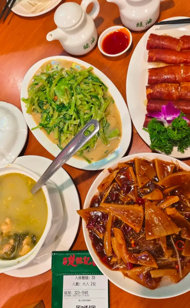今晚我同幾個朋友難得聚埋,去左一間充滿香港風情嘅地道風味小炒店。店面唔起眼,但一入到去就聞到陣陣鑊氣,霓虹燈招牌加綠色嘅懷舊鐵閘,滿滿的香港情懷,好有feel,我哋四個人,叫咗六個餸加一個湯猴頭菇蟲草花淮山螺頭煲豬骨湯湯底清甜得來帶住淡淡藥材香,螺頭肉厚實彈牙,飲一口就暖到入心,涼涼哋嘅天氣飲就最啱鑊氣豉椒炒蜆蜆肉肥美,每隻都吸滿豉椒汁,豉椒汁超好食,真係好有鑊氣西楚霸王雞雞上面有好多香蔥同埋脆蒜,配埋雞肉一齊食好香口,雞肉嘅肉質嫩滑楚撚記小炒王就係經典小炒拼盤,魷魚、蝦米,韭菜樣樣齊,炒得火喉十足,份量十足金銀蒜粉絲蒸開邊蝦蝦肉鮮甜,蒜蓉香而不嗆,粉絲吸晒湯汁,佢哋用嘅蝦都幾大隻,咬落去啖啖肉拔絲焦糖香燒脆腩仔脆皮嘅燒腩仔,外皮超脆,唔會硬,夾埋外層嘅焦糖,甜鹹交融,食到停唔到口懷舊豬油撈飯(復刻版)熱騰騰白飯撈埋豬油同豉油,簡單得來最打動人心甜品有三款: 番薯糖水暖笠笠,綠豆清心丸解膩,桂花太白拉糕軟棉綿,香氣撲鼻。四個人食到見底,埋單人均二百左右,性價比高,唔怪之得咁多人排隊,值得encore…查看更多