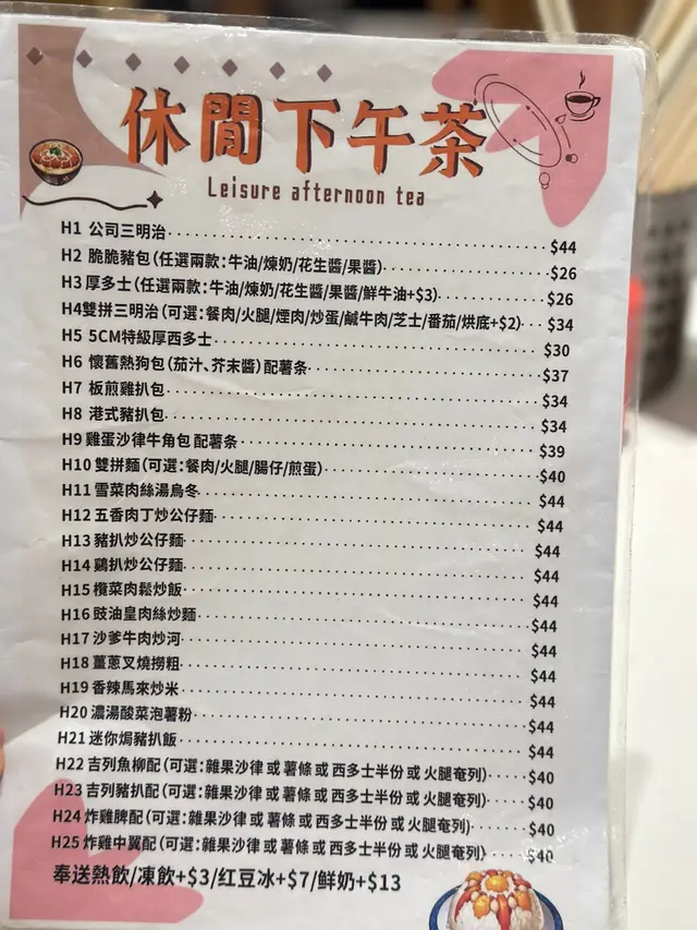 上水🌟榮光粉麵小廚🌟絕對可以滿足地道食客味蕾,餐廳環境簡樸,菜式選擇多,而且鄰近地鐵站,夠哂方便😬🔹5CM特級厚西多士厚西多士外層金黃酥脆,內裡滿滿軟滑嘅花生醬,面頭再淋上糖漿,咬落香脆惹味,好有幸福感,真係好好食!🔹銀芽肉絲炒麵炒麵色香味俱全,麵條炒得剛好唔油膩,銀芽搭配肉絲咬落去非常爽口。嫩滑肉絲配清脆銀芽,味道層次分明,忍唔住食哂。🔹芝士鮮茄焗鴛鴦扒飯鴛鴦扒外皮金黃,裡面肉質鮮嫩,配豐富芝士,融化後香濃可口,再加入新鮮番茄,令整體味道清新唔膩口,飯粒更吸滿醬汁,好出色。🔹鮮蝦雲吞雲吞皮薄彈牙,包住新鮮蝦肉,鮮味十足,搭配清湯及生菜,清新之選。🔹炸雞髀配火腿奄列炸雞髀外脆內嫩,雞肉鮮美,火腿奄列充滿濃郁嘅蛋香,咬落口感豐富。🔹凍檸檬茶清新解渴,酸酸甜甜,飲落瞬間清爽。🔹熱香滑奶茶奶香濃郁,茶味悠長,冬天飲返杯熱飲即刻暖笠笠。榮光粉麵小廚地址:上水龍琛路34號地舖