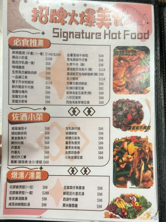 行完山,在上水附近。一於搵附近的地方找餐廳進食。見了這一間餐廳,入去醫肚。餐廳分為下層和上層,上層更設有包房。 整體而言,非常有「家」的味道的餐廳最後我們叫了以下食品。1.金薯蜜椒牛柳粒($98)牛柳粒味道香濃,但係有少少黑椒的味道。配上金黃酥脆的薯仔,配上他們的蜜糖醬汁,非常惹味。2.七味金磚豆腐($68)佐酒一流的小菜,份量非常多,每一粒都外脆內軟。3.一品鎮江骨($88)鎮江骨上菜的味道非常香濃,陳醋味非常香濃。酸甜味十足,是一個開胃的小菜。4.花膠雞煲翅($68/位)奶黃色的花膠雞煲翅,用料十足,有大大的一條花膠,雞湯味濃。5.椒絲腐乳通菜($68)新鮮爽口的通菜,配上腐乳醬汁。6.沙爹肥牛粉絲煲($88)平時必叫的肥牛金菇粉絲煲,醬汁香濃,還配有大量的粉絲,每一口粉絲都掛滿了醬汁的味道。正7.檸檬茶(熱)($10)8.柑桔蜜(熱)($12)