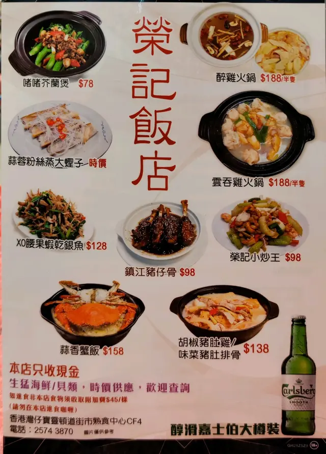 榮記(東成)飯店 (灣仔) 網址: https://s.openrice.com/QrbS0CpK000 地址: 香港灣仔寶靈頓道21號鵝頸街市1樓鵝頸熟食中心CF4號舖 電話: +852 25743870