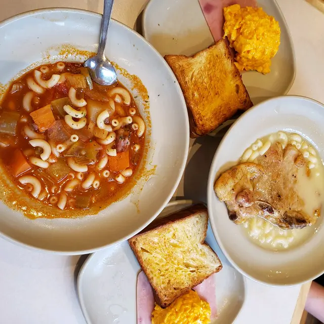 瑞士雞翼撈麵,配丹麥多士,火腿、炒蛋