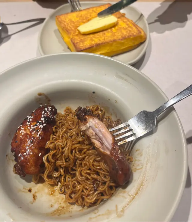 瑞士雞翼撈麵,配丹麥多士,火腿、炒蛋