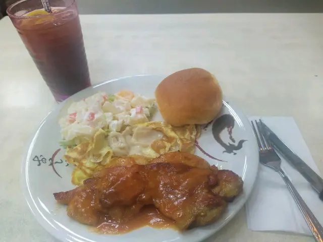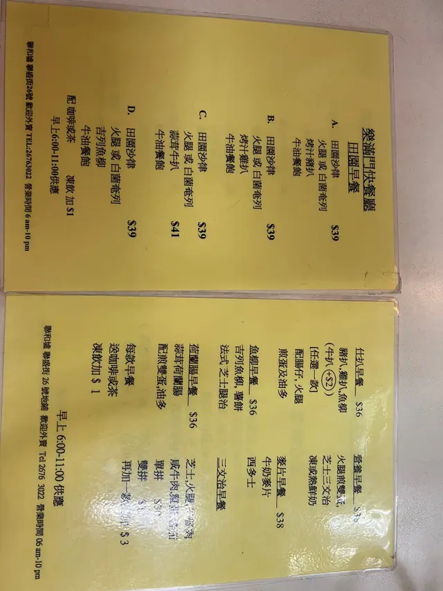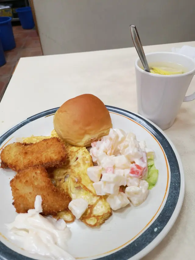 食店嘅裝潢已經可以顯示到有多久的歷史,佢由門口開始已經吸引到我!畢竟懷舊老店已經不多了吧!入到去,見到2邊都係卡位,中間就係長枱,牆身掛滿牌仔,菜式名稱及價錢寫得滿滿!炸魚柳田園早餐配熱檸水~已經好少可以喺早餐時段食到沙律喇~佢配上炸魚,就剛好中和油膩感(同埋罪惡感),始終一早就食炸嘢,都會熱氣吧!沙律主要係薯仔、甘荀……等等都幾飽肚架!炸魚柳份量都唔細,而且都好香口脆身,佢會喺碟邊放上沙律醬,用幾多可以自己決定!火腿奄列呢個配角係我心目中嘅主角,睇到佢餡內有汁,除了火腿外還有甘荀嗎?同一般乾爭爭嘅奄列有大分別呀!查看更多