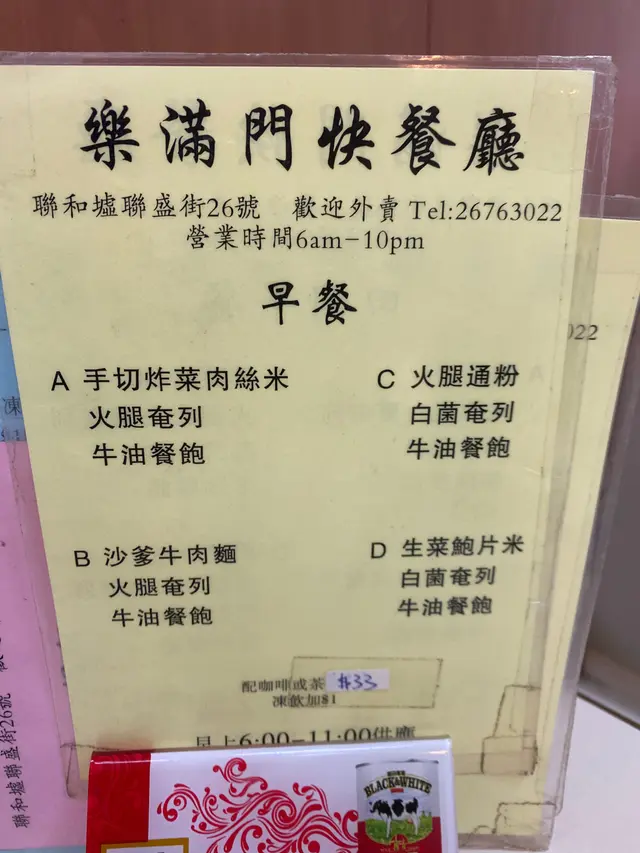 一早黎到粉嶺聯和墟,梗係要睇下有咩靚早餐食啦,呢頭吾係太熟,所以都冇咩心水,唯有周圍行下la. 黎到呢間樂滿門,普通茶餐廳裝修,見到入面都有吾少客,應該吾會差掛,於是就入去試下啦。菜單都係普通茶餐廳款式,不過驚喜既係有沙律,比較少早餐係配沙律,咁梗係試呢款再加雞扒等左一陣就有野食啦,沙律係雜果沙律,份量都吾少,塊雞扒幾大塊,而且係配牛油餐包,我比較鐘意餐包多過多士~,個奄列都吾錯,料多,蛋煎得剛好呢個價錢吾算太平,不過質素都吾錯,下次如果再經過都可以再食查看更多