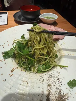 很有特色的芫荽拌麵擺碟感覺豐富麪底是使用永樂麵廠製造的芫荽麵不用任何配料已經有很清甜的芫荽味口感彈牙,份量足芫荽醬料相對忌廉味比較重,不是我的口味配月見蛋黃,黑椒和芝麻,還有新鮮芫荽就非常好吃叉燒肉質嫩滑,大大片,不會肥整體口味清新,很喜歡,很推薦芫荽控一試🤍