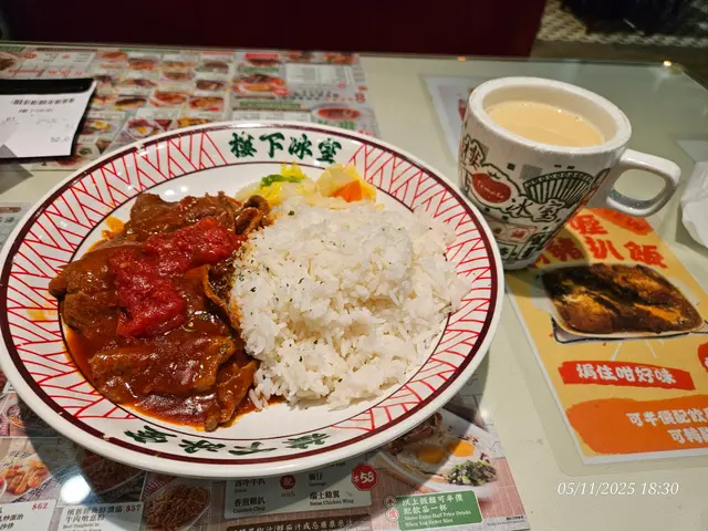 今晚約左人8點鐘,想系熊貓酒店附近食完飯至去,一條友最後都系搵茶記,因為哩間上次試過下午茶,本來想去隔離百份百,經過個男侍應鬼咁熱情系咁sell下午茶,我問而家仲有?佢話到6點半,咪只是睇下餐牌應酬下,睇到有哩個飯有幾好喔,咪入去嘍濃番茄牛肉飯($52)4分-又真系幾濃,因為應該都系用番茄醬,但都系比祝你啊-牛肉分量亦多,問題系幾多根-飯好熱。好立克真系太甜,純個人問題,你可以話足料,最後都系飲水。抵食(4分)-下午茶比足夠分量,質量亦有咁上下