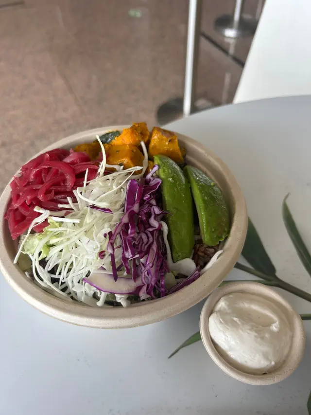 Recently, we wanted to keep fit. Therefore, we searched for some healthy restaurant. We found there is a vegetarian restaurant. We order Banyan set, including sourdough flatbread and salad bowl. Also, we order something sweet - Macadamia Chocolate Chip Cookie. Banyan contains Grilled tempeh, fried eggplant, roasted garlic hummus, cabbage, tomato slices, amba sauce. As soon as it was served, I found it very appealing—the colors were incredibly vibrant. The vegetables were very fresh. The salad is in big portion, we feel full after eating it. Normally, I wouldn’t eat something so healthy and rich; every bite was refreshing and healthy. It went perfectly with the salad dressing,the wrap is yummy, we loved it very much. The chocolate chip cookie is not too sweet, A nice dessert for yummy dinner. To my surprise, it was amazing! This vegetarian restaurant not only serves healthy food but also offers a lot of delicious choices. It turns out vegetarian food can be diverse and creative—definitely worth another visit.…查看更多
