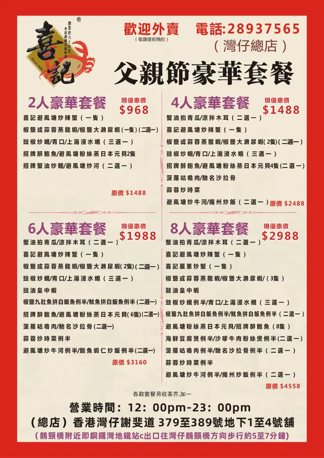 就嚟父親節,係時候要孝敬下老竇,所以今日我就帶埋老竇阿媽同哥哥我哋一家四口來個橋底辣蟹豪華四人套餐!齊齊祝早慶祝父親節快樂!4人豪華套餐有..蟹油拍青瓜,涼拌木耳喜記避風塘炒辣蟹一隻,蒜蓉蒸龍蝦,椒鹽大瀬尿蝦2隻豉椒炒蜆,青口,上湯浸水蜆招牌醉飽魚,避風塘粉絲蒸日本元貝4隻菠蘿咕嚕肉,馳名沙拉骨蒜蓉炒時菜避風塘炒牛河,揚州炒飯超級豪華!全部都好yummy!食到我地個個攬住個肚!爸爸表示好滿足,我見爸爸食得開心!我都安心查看更多