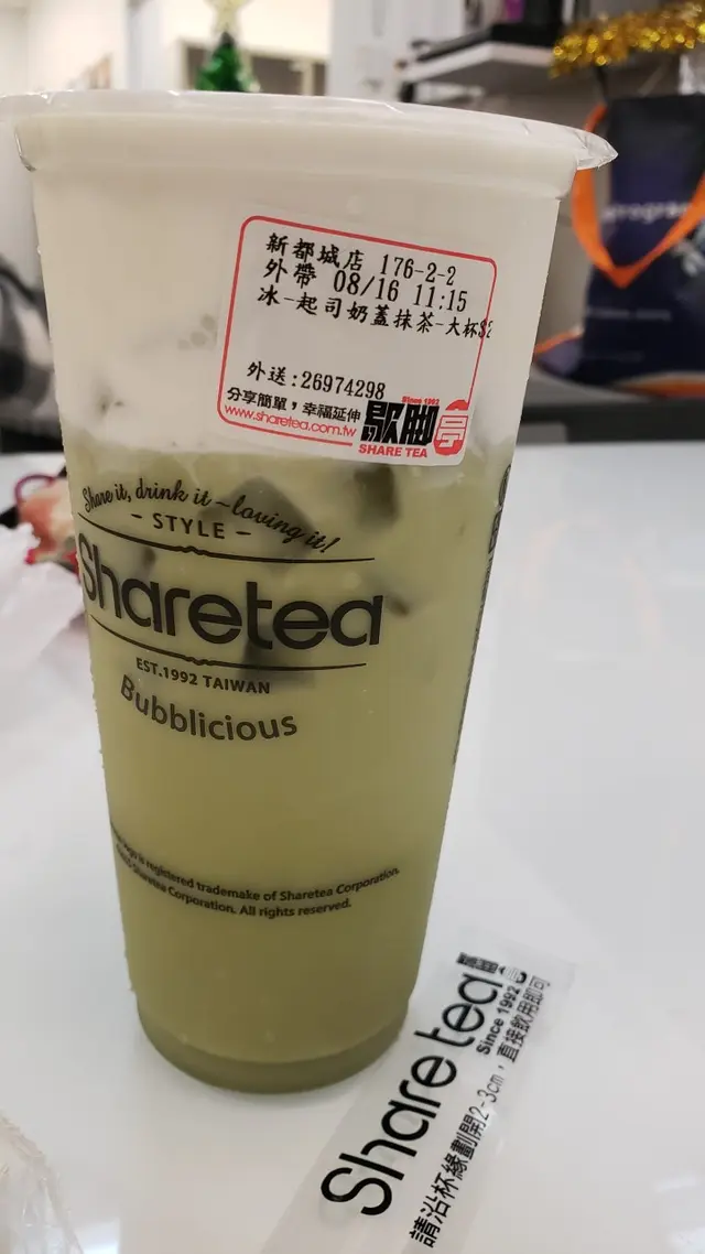 今日同朋友行下行下街,突然有啲囗渴,見到有sharetea,朋友就買咗杯珍珠奶綠,而我個人對珍珠就一般般,所以買咗杯蜂蜜綠茶加甜蜜乳霜。蜂蜜綠茶加甜蜜乳霜——味道方面,我並冇去特別走啲咩,佢嘅蜂蜜味好突出,啲綠茶都好有茶香,仲有啲苿利味,而且乳霜都好濃醇,整體來講,呢杯係一杯比較甜飲品,但除咗甜,值得一試。外貌方面,本身嘅綠茶有自己特定嘅顏色,但隨着時間,啲乳霜會慢慢融入綠茶到,變成一個漸層。珍珠奶綠——味道不錯,但稍為單調。啲愛買並沒有任何的突出。查看更多