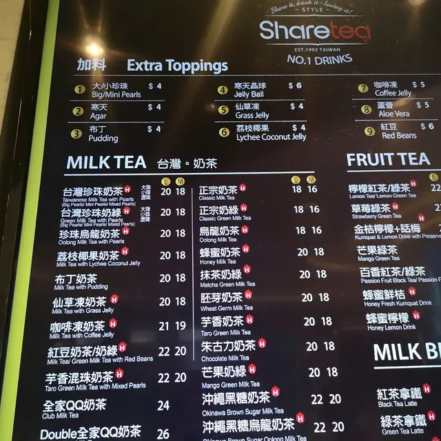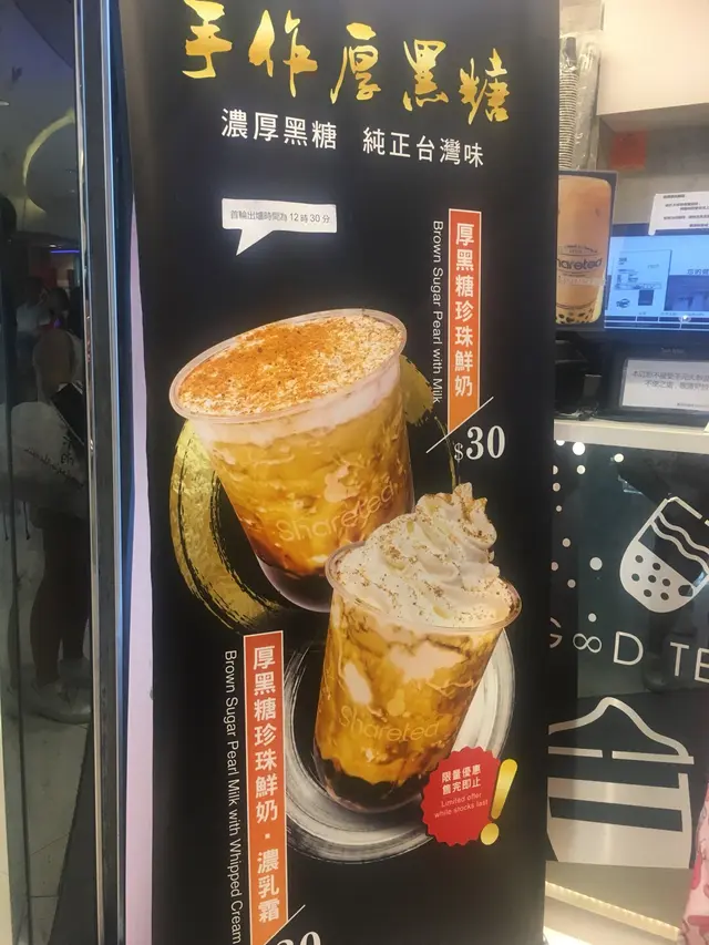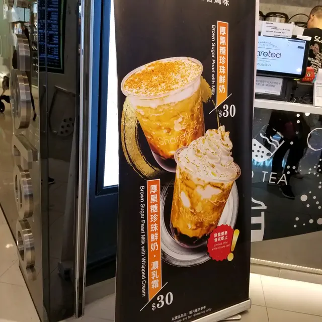 呢期勁HIT既黑糖珍珠鮮奶你又試左幾多間??就咁亂UP CWB一條街都3間過江龍, 但都要排隊, 好可惜我一間都未試到, 我諗總有機會既, 今日就係屋企樓下見到呢間SHARE TEA放左個2奶架, PROMOTE緊厚黑糖珍珠奶, 另外仲有杯係上面再加CREAM, 一樣價錢!! $30!!忍唔住要試一試!!!心諗一定唔會好正, 因為都冇見FD/新假X又講過呢間出, 但係結果讓我好驚喜!!!我雖然冇試過其他, 但我覺得SHARETEA呢杯都好正!!首先我係完全冇少呢少個樣, 因為我想試真D!!一飲落去第一啖就勁重奶味, 跟住就啜左粒珍珠, 超煙UN(我一向都覺得SHARETEA D珍珠係OK GE, 好過好多連鎖), 跟住再嚐到黑糖既味道!!真心唔太甜, 好好飲, 最後我係回家唔夠5分鐘既路程飲曬!! 重點下次真係可以少冰!! 因為我冇試過其他店, 所以就咁睇係個賣相差小小, 味道呢間係OK!!我諗我要認真考慮出去排下隊比較一下!!話曬我對珍珠都有一定程度既喜愛!!查看更多