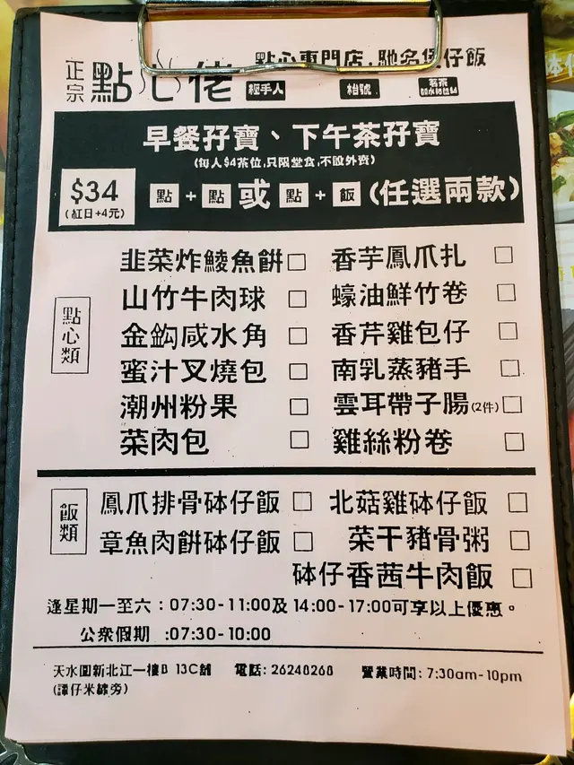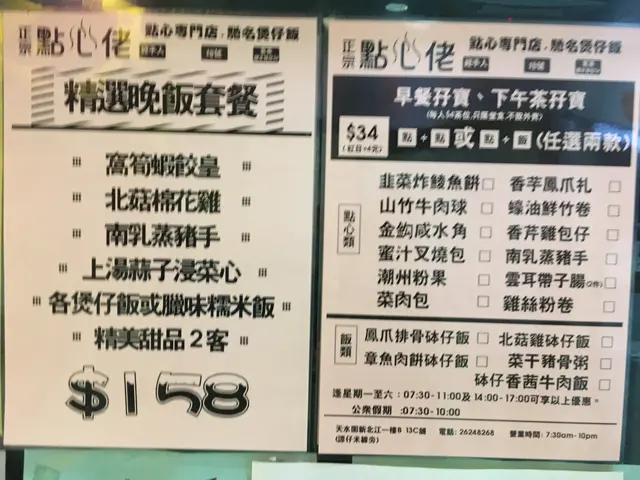 正宗點心佬 (天水圍) 網址: https://s.openrice.com/QrbS08Ru800 地址: 香港天水圍天湖路1號嘉湖新北江商場一期1樓B13C號舖 電話: +852 26248268