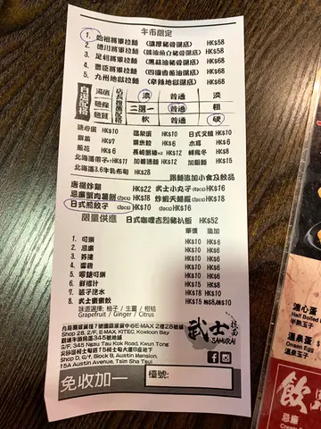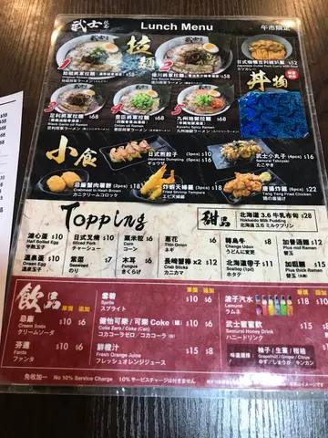今天來到九龍灣EMax的歡樂天地玩,晚餐亦在EMax內解決。想不到這裏有這麼多食肆。我們最後決定在武士吃日式拉麵。我和朋友每人分別叫了一碗拉麵及小吃。足利將軍拉麵黑蒜油豬骨湯底,選擇了濃湯底及粗麵。黑蒜油香氣撲鼻,重口味控必愛。先喝一囗湯底,豬骨味香濃,黑蒜油惹味。粗麵彈牙,粗麵更能掛湯汁,粗麵混合黑木耳絲吃,感覺爽口,亦能平衡一下湯底的膩。豊臣將軍拉麵四國香蔥湯底,選擇了濃湯底及普通麵。拉麵上佈滿了大量蔥花,很吸引。先喝一口湯底,湯底鮮甜,充滿蔥花香氣,亦有乾蔥的惹味,還有少少黑椒吊味。這款湯底沒有黑蒜油湯底般濃稠,較為輕盈。糖心蛋半熟,叉燒薄薄一片,半肥瘦,肉質軟腍,脂肪入口即溶。普通面亦彈牙,但較粗麵軟。章魚小丸子熱辣辣新鮮上枱,木魚絲不斷舞動,非常吸引,小丸子外層香脆,內裏軟綿綿,中間有一粒八爪魚實在是大人小朋友都愛吃的小吃。唐揚炸雞分量很大,炸雞香脆,漿粉已經調味,沒有很厚身,雞肉保持了肉汁,沾上日式沙拉醬及日式燒烤醬,感覺更惹味。…查看更多