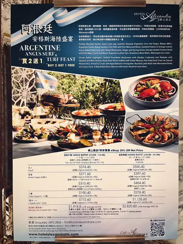 踏入秋季,不少酒店自助餐都換上新主題,歷山酒店歷山餐廳由即日起至12月6日,推出全新主題「阿根廷安格斯海陸盛宴」自助晚餐,網店有自助晚餐預付優惠,兩位付費成人可享7折,折實價連加一每位$550.40,一位11歲以下小童可免費享用,兩大一小只需 $1,135.60,折上折優惠超高性價比,成人生日買5送1及免費生日蛋糕,自助晚餐每逢星期五及六18:30 - 21:30供應,可以不追不趕地食足3小時。入座前可到走廊大堂打卡,宮廷風酒店設計概念融合維多利亞時期的歐式經典及現代時尚格調,以光彩奪目的金色與充滿神秘感的紅黑色為主調,配襯大型水晶吊燈、黑白菱形雲石地板、落地玻璃門窗、鏡面設計、鍍金鏤花大門等,裝潢優雅華麗,奢華貴氣盡顯,瀰漫著夢幻氛圍感。餐廳樓底夠高,甚有空間感。全晚冰鎮海鮮源源不絕地供應,refill 速度亦夠快,款式包括美國生蠔、蟹腳、凍熟蝦、青口和海螺,海鮮控必能大飽口福。回本位又怎能缺少即開生蠔?!質素夠新鮮,將鹹鮮海水、嫩滑冰爽的蠔肉一併吞下。另一重點就是位於即切烤肉區的燒穀飼阿根廷安格斯肉眼牛扒MB2+,作為奪得世界牛扒挑戰賽金獎肉眼扒,其脂肪分佈均勻,牛味更為濃郁,可以沾上四款醬汁 - 阿根廷香草醬、洋蔥番茄醬、番茄蛋黃醬和玻利維亞辣醬,令肉香再昇華。即切肉類還有燒加拿大豬鞍和香草燒羊架,豬鞍鬆軟多汁,羊架肉質細嫩,羶味不過重。香煎鴨肝即叫即煎,表皮香脆,內裡卻是軟綿順口,散發濃濃的鴨油甘香,伴以西瓜和陳醋,中和肉食的油膩感。每位奉送一客焗牛骨髓配蒜蓉多士,經高溫烤焗後油潤甘香,塗上脆卜卜的多士,就如溫熱的牛油入口即化,令人胃口大開。阿根廷海鮮飯亦是新主題專屬菜式,加入蜆、大蝦、青口、甜椒,以及香辣惹味的阿根廷香腸燉煮入味,香氣撲鼻,飯粒飽吸濃郁鮮味精華,入口煙韌而帶咬口。熱盤款式夠多元化,集合阿根廷式砵酒羊肚菌焗鱸魚柳、阿根廷式橙味龍蝦汁炒大蝦、雜菌薑蔥焗肉蟹、百花炸蟹鉗、清蒸沙巴龍躉、炸羊肚菌釀蝦膠、鮑魚栗子炆雞、翠綠花枝蝦仁、菠蘿脆皮咕嚕黑毛豬肉、黑椒牛仔骨、脆炸軟殼蟹、阿拉斯加蟹肉鮑魚釀大啡菇配菠菜芝士、辣茄蓉汁燴黑青口、燒香草春雞、印式咖喱雞、印度香米、烤焗蜂蜜薯配脆香煙肉及芝士、南瓜野磨菇忌廉汁蝴蝶粉等等。清蒸沙巴龍躉大條又厚肉,魚肉鮮嫩,最原始簡單的做法原汁原味。百花炸蟹鉗外層炸至金黃酥脆,內餡扎實彈牙,飽滿鮮甜。翠綠花枝蝦仁真材實料,魷魚與去殼蝦仁爽口彈牙,清炒煮法突出食材本身的鮮味。羊肚菌花膠響螺燉雞湯清澈見底,補而不燥,滋陰補腎。還有老黃瓜煲豬骨湯和蘑菇忌廉湯。魚生刺身有紅蝦、帶子、八爪魚、希靈魚、吞拿魚、油甘魚、三文魚,即叫即切,另有雜錦壽司加州卷。前菜冷盤羊肚菌露筍沙律伴鵪鶉蛋配松露油醋汁、巴馬火腿配蜜瓜、煙挪威三文魚、泰式鳳爪沙律、泰式牛肉沙律、雜錦凍肉拼盤、鹵水牛展、紅菜頭沙律、意粉沙律等等。甜品區包括阿根廷果醬撻、士多啤梨蒙布朗、芒果拿破崙、開心果脆卷、白朱古力車厘子慕絲杯、鮮果乳酪杯、木糠布甸、椰子慕斯、焦糖燉蛋、黑森林杯、北海道3.6牛乳麵包布甸配雲呢嗱汁、蛋白杏仁茶、蛋撻、水果果凍、柚子凍糕、朱古力噴泉、甜甜圈、迷你杯子蛋糕塔、自家製朱古力、瑪德蓮貝殼蛋糕、雜錦曲奇、雜錦糖果和時令鮮果。一層疊一層的芒果拿破崙酥皮香脆中滲出輕盈的牛油香,再加上新鮮芒果切片和軟滑的吉士,達到味蕾上的美妙平衡。開心果脆卷趕上近期大熱的開心果熱潮,散發果仁芳香,充滿層次的滋味在嘴裏一次綻放。即製法式可麗餅即叫即製,可以自選配料和醬料,餅皮口感柔韌,揉合軟滑忌廉和大粒甘甜的紅豆。最後吃得再飽也不要忘了任食Movenpick雪糕,總共有六款不同口味。自助飲品吧提供無限暢飲精選紅酒、白酒、啤酒、汽水、橙汁、蘋果汁、咖啡,可以隨時自斟自飲。…查看更多