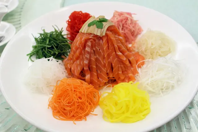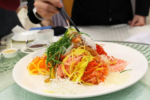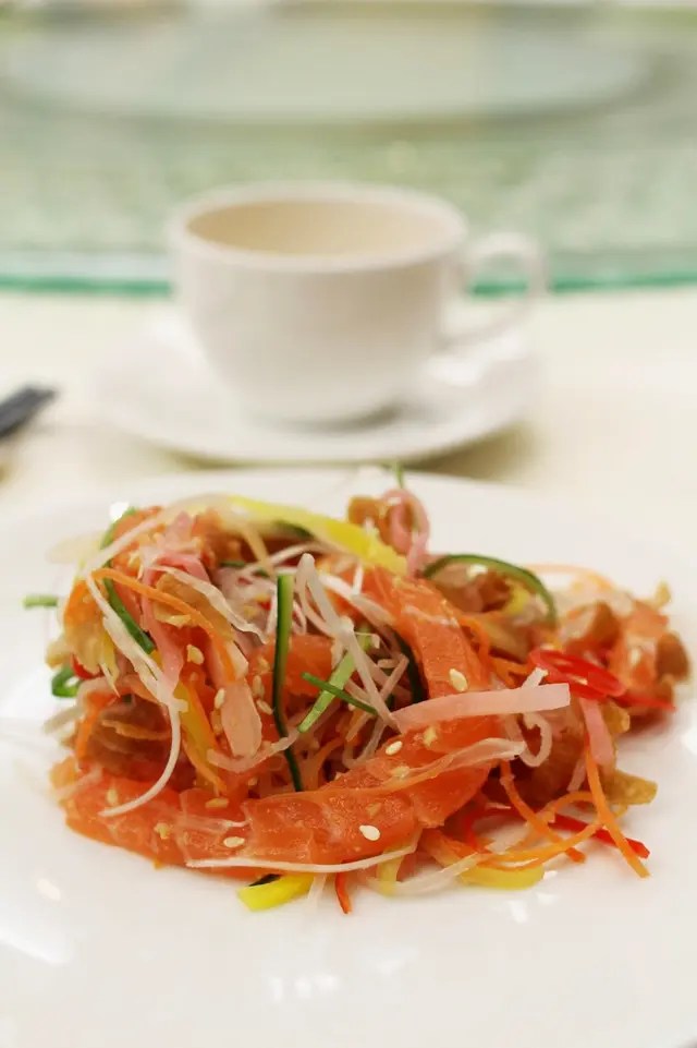 過年始終是中國人的重要節目,一定希望吃得好;殷悅就是一個不錯的團年/開年飯之選。位處悅來酒店 30 樓,餐廳環境及景觀都很一流,所有食物不加味精,今年還成了米芝蓮推介餐廳。而最新推出的滋潤、養生,及新春吉慶菜式都有水準,味道頗有驚喜。首先是新春菜式的 悅來鮑撈起 Aablone Lo Hei ($248),寓意越撈越旺,風生水起。這版本包括三文魚、子薑、青瓜、胡蘿蔔、芝麻等,食物上檯拍照後,可讓侍者代為撈起,很方便。 我長著一個半西半中的胃,對這有點似西式沙律的撈起從來都喜歡;特別成品子薑的甜辣味突出,吃來份外清新醒胃。食客還可選配上芥末汁/芝麻汁吃,兩款都不錯。 接著吃 烏金麒麟乳豬件,這可是 2015 版港澳米芝蓮的推介菜式呢。成品取用清脆乳豬皮,拌上咸香鮮美烏魚子片,及微辛大白蔥片,口感豐富迷人不膩,果然很好吃,吃完還意猶未盡!另一款米芝蓮推介菜是 照燒黑松露菌牛柳粒,牛魔要留意了。