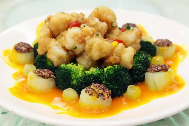 繼續有【滋補宴】的菜式:平分秋色 Stir-fried Prawns in Chardonnay Sauce and Winter Melon with Quinoa (海棠藜麥配沙當尼蝦球),它又是一款得獎菜呢。 藜麥是款超級健康食物,配搭冬瓜估不到的合拍;以白酒炒起的蝦球鮮美爽彈,香氣與味道都非常迷人,很讚。而配菜除了西蘭花,還有去核的甜美提子,與醬汁相映成趣了。
