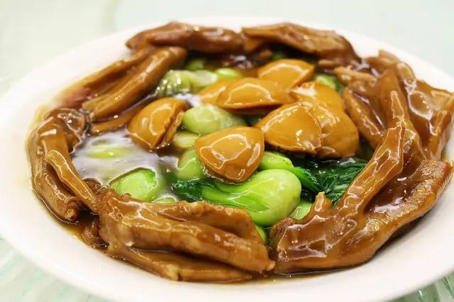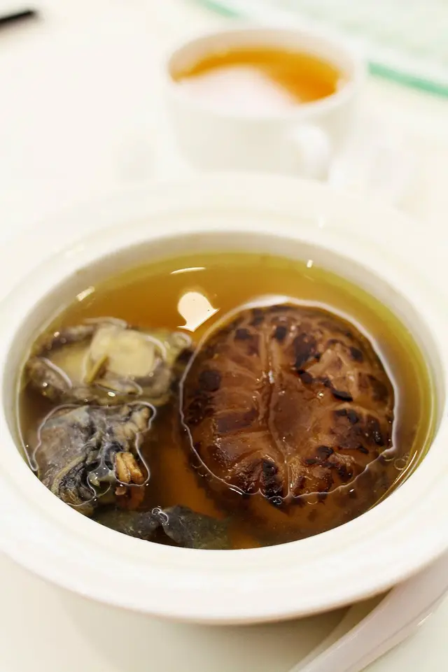 不要緊,美味菜式陸續有來:接著有【滋補宴】的 原隻鮑魚天白菇燉竹絲雞 Doubled-boiled Silky Chicken Soup with Fresh Whole Abalone and Black Mushrooms,由圖可見用料十足。竹絲雞煲起的雞湯鮮美而清爽不油,入口帶有黨參的淡淡甘香,邊飲滋補的湯水,邊吃鮮美的原隻鮑魚,以及肥大肉厚的天白菇,感覺好不美妙。