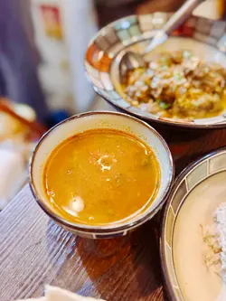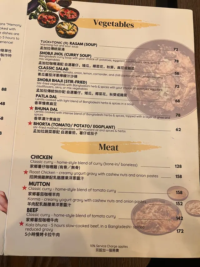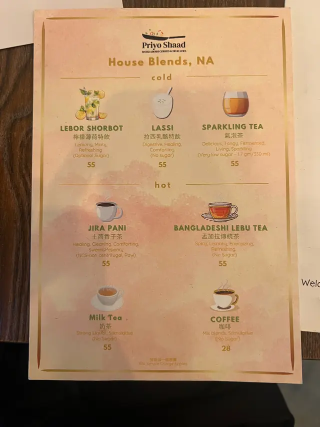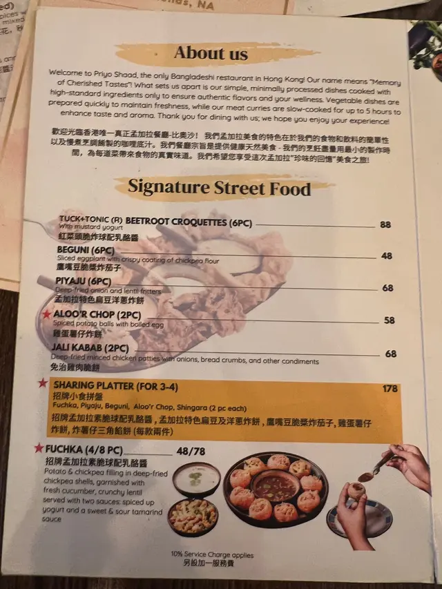 之前睇millmilk介紹呢間香港唯一嘅孟加拉菜,覺得好特別,於是有一日同朋友嚟到一試☺️ 呢間喺PMQ附近嘅餐廳雖然細細間,但係入面嘅裝修都幾靚,因為樓面只有老闆一個人,所以有啲時候都覺得佢好忙😂 好彩呢度嘅廚師都好快手,上菜超級快,落單冇耐就有嘢食啦☺️我哋叫咗一個tasting menu ($278)同散叫咗少少嘢,咁樣嘅叫法就算兩個人都可以試到比較多嘅菜式🤓⭐️ Mini street food platter❤️7.8⭐️ 孟加拉傳統菜湯❤️7.8⭐️ 招牌燒雞髀配乳酪腰果洋蔥汁❤️8.5⭐️ 香米飯❤️8.5⭐️ 自家製孟加拉芒果雪糕❤️7.8頭盤有紅菜頭脆炸球配乳酪醬,仲有鷹嘴豆脆漿炸茄子☺️ 兩款都係炸得香脆,但不油膩,特別係脆炸球配乳酪醬入面嘅餡料好清新😍傳統菜湯比想像中濃味以及有點辣到,幾惹味☺️ 主菜嘅燒雞髀真係大推!個醬汁勁好食🥹 而且雞肉嘅份量超級多🤣 老闆推介配香米飯,果然冇介紹錯!米飯粒粒分明,帶點椰香,仲有少少果仁,好特別!最後老闆仲好好人送多咗一個芒果雪糕俾我哋,食落有啲似雪凍咗嘅芒果乳酪雪葩咁樣,夏天用嚟消暑好,而且重點係唔太甜🙊⭐️ 家鄉蕃茄咖喱牛肉 ($142)❤️7.5⭐️ 自家製全麥烤餅 ($25)❤️7.0⭐️ 雞蛋薯仔炸餅 ($58)❤️8.8我哋仲加咗呢幾樣食物,咖喱牛肉都好食唔會太過Heavy,但係比起燒雞就冇咁有特色,下次會嘗試慢煮牛肉多啲🙊 另外全麥烤餅我同朋友都覺得一般,反而米飯有驚喜,可能因為太薄同埋味道太健康🤣 見到隔籬枱嘅蒜蓉naan好似好正🙊 而雞仔薯仔炸餅係必叫!薯蓉本身入面撈咗唔同嘅香料,所以食落好有風味,重點係乳酪醬真係好好食🥹 不知不覺一個人食咗一舊都嫌唔夠喉🥹整體嚟講餐廳幾有特色,而且價錢唔算好貴,如果老闆試吓引入QR code落單,相信可以幫佢減輕下樓面嘅負擔🤣 …查看更多