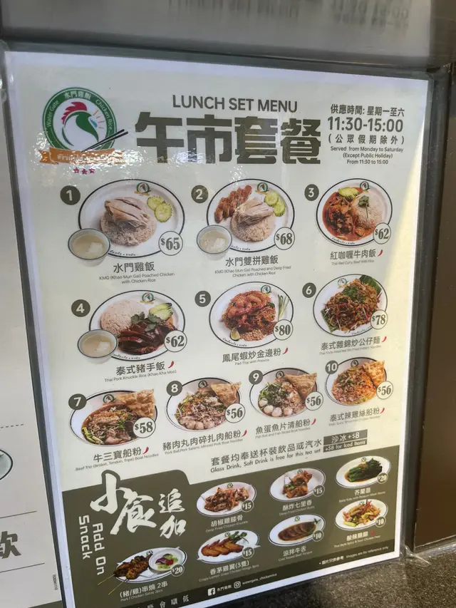 從門口就見到廚房的廚窗掛滿了一隻隻肥美的水門雞,非常吸引。店子分內和外座位,內裏有單人吧台和一張大長枱。選擇種類多,有水門雞、沙律、紅咖喱、阿來、小食串燒、泰式船麵、飲品和甜品,還提供生酮飲食。點咗半隻水門雞($108)配雞汁和湯,單單賣相已很有心思,吸引!雞完全沒有骨,啖啖肉,皮爽肉嫩,唔肥膩,正!再蘸些秘製雞醬,香辣惹味,更美味!仲配了些雞紅、雞腸和雞腎,三款都爽口美味,食得滿足!以優惠價追加香辣牛舌 (8片/$20),抵!好腍嫩,微辣鹹香,令人回味!叫咗碗豬泰式船麵 ($60),有豬肉丸、扎肉和豬肉碎,再加了些四季豆、芽菜、炸脆片,都幾豐富!河粉好滑,豬肉碎就略為肥咗啲,但豬肉丸和扎肉就彈牙,有些香料香,辣辣地,好美味!蝦頭膏炒雜菜 ($56)用料多變,有椰菜、西蘭花、椰菜花、甘荀、粟米芯、蘑菇等,以蝦頭膏爆炒,鹹香惹味,好有鑊氣。老公要咗杯凍泰式奶茶(+$8),佢話完全跟在泰國飲嘅奶茶味道相似,奶香茶濃,甜度適中。我就要杯熱生薑蜜 (+$8)夠晒辛辣,加上蜜糖的甜美,飲到火辣辣。…查看更多