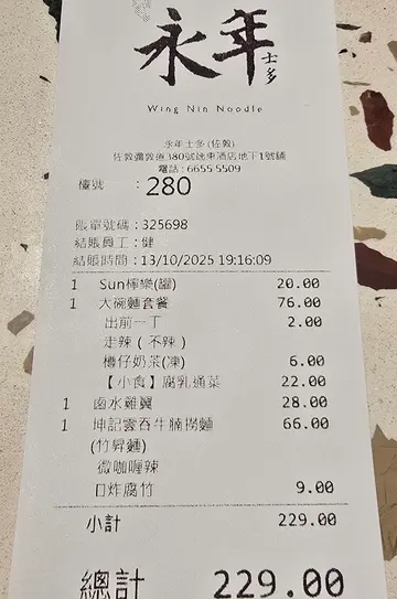 趕時間下場活動,都係食碗麵比較好。發現逸東酒店,依家都有間永年,元朗總店未試過,不過過去試下同尖沙咀有咩分別都好,一去到除左經典,都發現有新嘢。等緊嘅時候,欣賞下呢度裝修車仔餐牌坤記雲吞牛腩撈麵 $66 (竹昇麵) 微咖喱辣 食車仔麵,原來都可以配生麵。永年同坤記竹昇麵合作,車仔麵店都食到雲吞撈麵。麵爽滑彈牙,雲吞皮薄餡靚,豬肉配一隻大蝦。加上永年嘅配方,香甜嘅豬腸汁,同好辣嘅咖哩汁,加少少已經夠,完全係車仔麵風味。牛腩夠腍,而蘿蔔最有驚喜,煮得入味無渣,冰糖之後都有少少咖哩辣味,調味好特別。炸腐竹 +$9黑白腐竹都非常酥脆,係有火鍋響鈴卷嘅感覺,如果湯底再熱啲,可能更有層次啦!大碗麵套餐 走辣 $76出前一丁 +$2 =78大碗麵真係好多料,豬腸、陳皮魚蛋、蘿蔔、豬紅 、豬皮 、雞翼、雞翼尖、 魷魚、紅腸同兩條菜心,出名嘅配料都試齊,每樣食材都好入味。麵底唔要平時嘅油麵,試下出前一丁,佢個麻油湯底配滷水汁嘅香甜,增加左唔少層次,竟然幾夾!腐乳通菜 +$22通菜爽脆冇渣,加咗腐乳醬之後,口感更滑。配辣椒片令味道有層次,不過記得小心辣椒籽,突然咬到就會好辣!🌶️鹵水雞翼 $28 滷水汁帶甜味,雞翼軟滑入味,但骨肉未完全分離,肉質少少緊實。整體感覺唔錯,有層次。🍗Sun檸樂(罐) $20原來係罐裝原味可樂,配黃色西檸,不過檸檬幾大片,食左咁多肉都可以解膩。樽仔奶茶 (凍) +$6樽仔奶茶茶味夠濃,都夠滑香滑,無冰粒避免淡味,不過奶茶本身帶少少冰沙,彌補冰凍感,感覺特別新穎。🧊總計 $229…查看更多