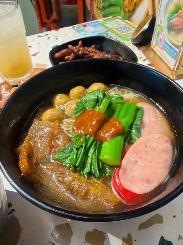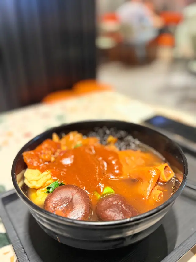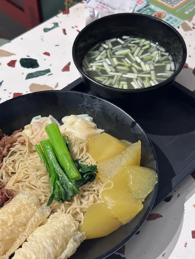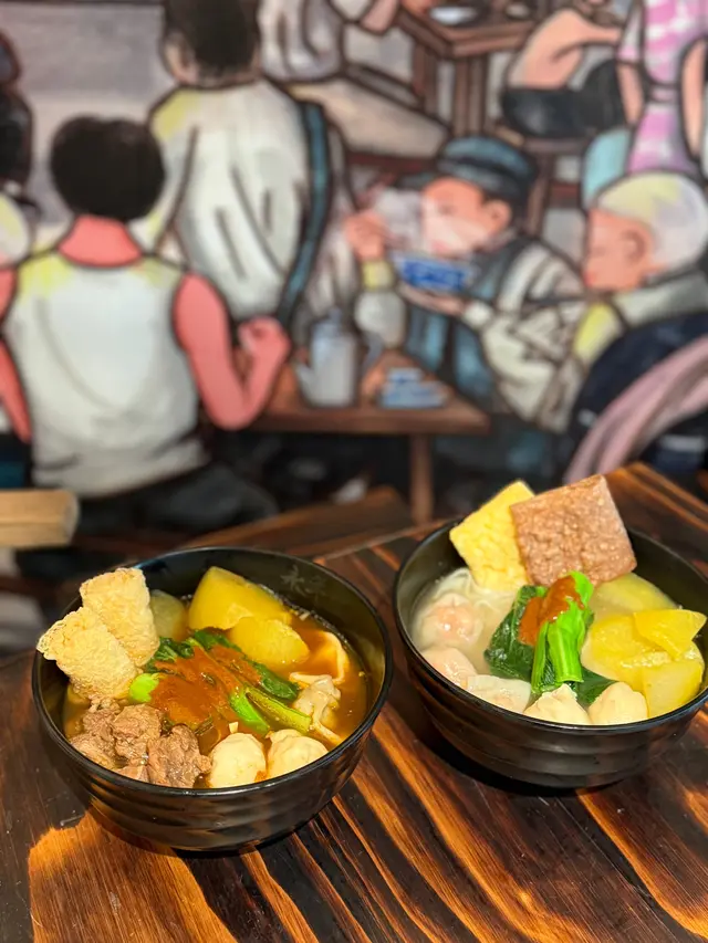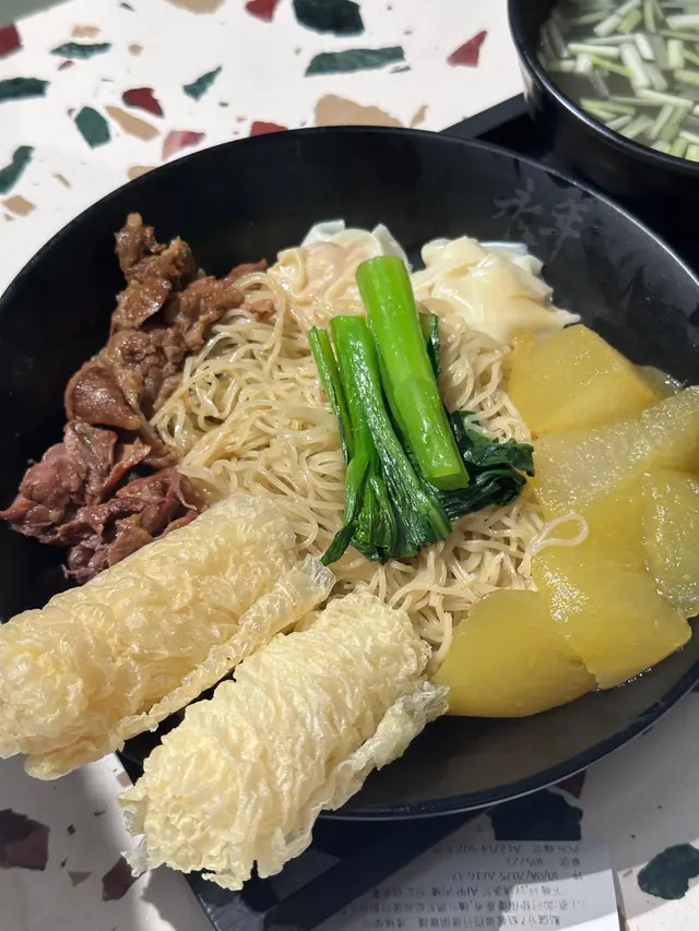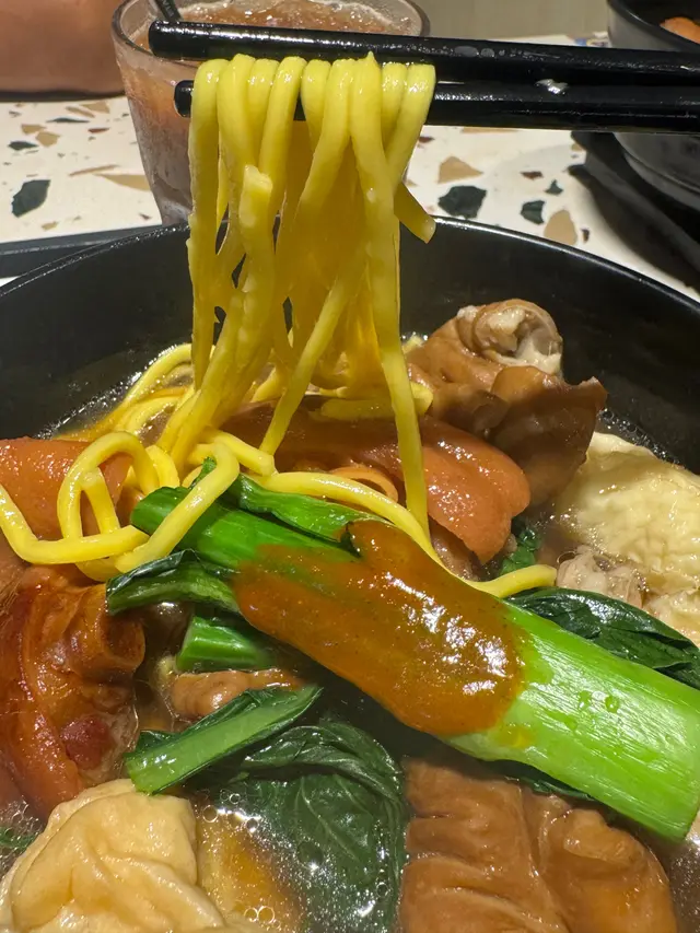 趕時間下場活動,都係食碗麵比較好。發現逸東酒店,依家都有間永年,元朗總店未試過,不過過去試下同尖沙咀有咩分別都好,一去到除左經典,都發現有新嘢。等緊嘅時候,欣賞下呢度裝修車仔餐牌坤記雲吞牛腩撈麵 $66 (竹昇麵) 微咖喱辣 食車仔麵,原來都可以配生麵。永年同坤記竹昇麵合作,車仔麵店都食到雲吞撈麵。麵爽滑彈牙,雲吞皮薄餡靚,豬肉配一隻大蝦。加上永年嘅配方,香甜嘅豬腸汁,同好辣嘅咖哩汁,加少少已經夠,完全係車仔麵風味。牛腩夠腍,而蘿蔔最有驚喜,煮得入味無渣,冰糖之後都有少少咖哩辣味,調味好特別。炸腐竹 +$9黑白腐竹都非常酥脆,係有火鍋響鈴卷嘅感覺,如果湯底再熱啲,可能更有層次啦!大碗麵套餐 走辣 $76出前一丁 +$2 =78大碗麵真係好多料,豬腸、陳皮魚蛋、蘿蔔、豬紅 、豬皮 、雞翼、雞翼尖、 魷魚、紅腸同兩條菜心,出名嘅配料都試齊,每樣食材都好入味。麵底唔要平時嘅油麵,試下出前一丁,佢個麻油湯底配滷水汁嘅香甜,增加左唔少層次,竟然幾夾!腐乳通菜 +$22通菜爽脆冇渣,加咗腐乳醬之後,口感更滑。配辣椒片令味道有層次,不過記得小心辣椒籽,突然咬到就會好辣!🌶️鹵水雞翼 $28 滷水汁帶甜味,雞翼軟滑入味,但骨肉未完全分離,肉質少少緊實。整體感覺唔錯,有層次。🍗Sun檸樂(罐) $20原來係罐裝原味可樂,配黃色西檸,不過檸檬幾大片,食左咁多肉都可以解膩。樽仔奶茶 (凍) +$6樽仔奶茶茶味夠濃,都夠滑香滑,無冰粒避免淡味,不過奶茶本身帶少少冰沙,彌補冰凍感,感覺特別新穎。🧊總計 $229…查看更多