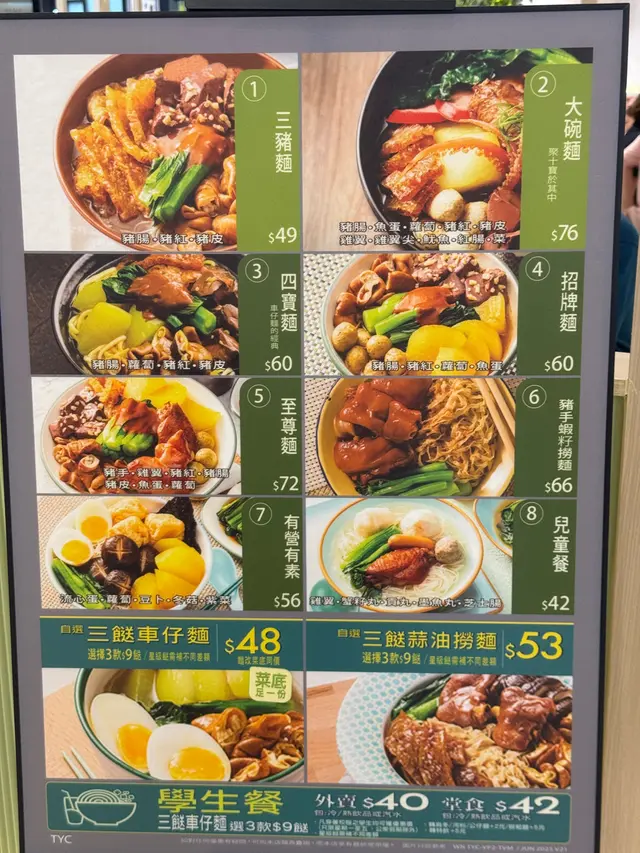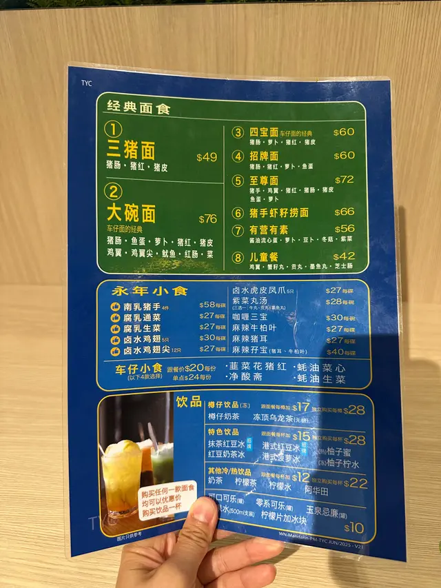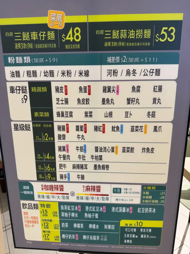 每次一好想車仔麵,就會去「永年士多」,佢哋嘅車仔麵麵底、配料都有好多選擇,出品亦唔錯,另外,仲有好多美味小食、特飲,不過我最欣賞嘅都係佢哋自家製嘅手工麻辣醬、招牌咖喱辣醬。自選三餸車仔麵(單點$54),韮菜餃,韭菜、豬肉比例平均;蟹籽丸,蟹籽口感卜卜脆;冬菇,口感厚肉,食落好Juicy;菜芯,味道清甜;蒜油撈麵,烏冬,口感煙韌,配以大辣手工麻辣醬食用,食落麻、辣兼備。自選三餸車仔麵(單點$48),魚蛋,陳皮魚蛋口感結實,食落帶有陳皮的清香味道;墨魚丸,口感彈牙,墨魚肉好大粒,食落帶有鮮味;魚皮餃,餃子皮口感Q彈,豬肉餡料肉汁飽滿;粗麵,容易掛汁,配以勁辣招牌咖喱辣醬食用,食落帶有咖喱香料味道。腐乳通菜(單點$27),通菜口感爽嫩,配以腐乳、指天椒食用,味道鹹辣。淨酸齋(跟餐$20),麵筋食落好爆汁,味道酸甜。韮菜花豬紅(跟餐$20),豬紅份量多,口感滑溜,沒有血腥的味道,配以韮菜花、牛腩湯底食用,食落好香口。港式菠蘿冰(跟餐$15),菠蘿份量多,菠蘿汁飲落味道酸甜。抹茶紅豆冰(跟餐$15),抹茶、紅豆份量一比一,抹茶茶味濃厚,紅豆口感綿密,但仍然食到顆粒感,整體甜度6.5分。…查看更多
