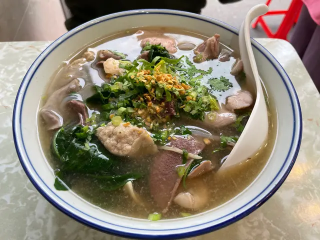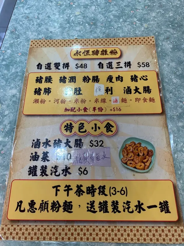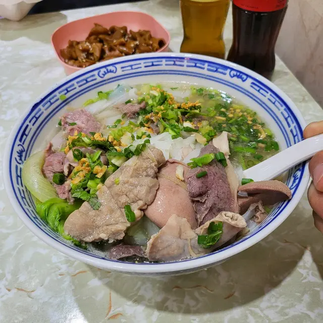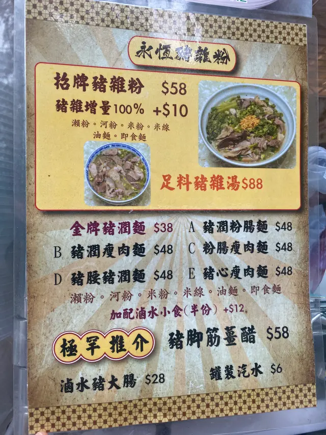 原本諗住食燒味飯行到過嚟冇開門,咁就試吓食豬什粉啦,之前行過好多次都冇食,因為店舖真係太細,但今晚食咗真係有驚喜喎👍🏻👍🏻👍🏻我係好鍾意食內臟嘅人,豬牛雞嘅內臟都好鍾意😎我叫咗碗"足料豬什湯",淨豬什嚟嘅,冇粉麵,因為我想食多啲內臟🤣 加咗$10花甲仔,再加咗$10枸杞葉,盛為$98!裏面有瘦肉、豬肺、豬肚、豬心、豬潤、粉腸,火候煮得幾好,唔會過熟硬晒,湯底超級甜,忍唔住攞隻大匙羹飲晒!份量都算多,好飽👍🏻👍🏻我老公一向嘴刁都讚好味!佢叫咗三餸,豬肺、豬肚、豬心,配公仔麵,都係成碗食晒,飲晒成碗湯😎除咗有辣椒油,仲有辣菜脯放喺枱面可以任加嘅,不過我同老公都唔食辣,所以就冇加到!睇返介紹,自設豬肉檔,大埔元朗天水圍都有豬肉檔,保證來源新鮮👍🏻但係店舖真係非常之細,只有三張摺檯即係六個位,而且冷氣唔夠,始終都係冇門嘅,有冷氣都走晒啦!大熱天時嚟到仲要飲晒成碗湯,大家嚟試嘅時候真係要有出汗嘅準備🤣🤣但係為咗食好嘢,我就唔怕熱嘅😁😁…查看更多