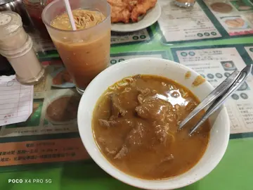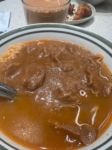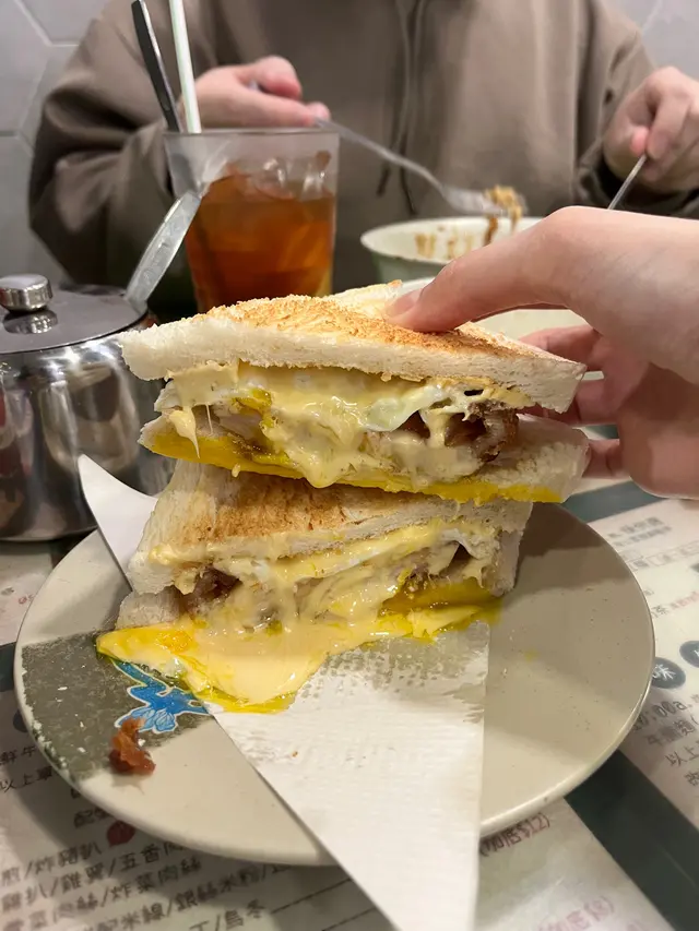 ⭐️ 沙嗲牛肉蟹王麵沙嗲牛肉蟹王麵係必嗌啲嘅美食之一👍🏻👍🏻,喺餐廳度我睇到個個都喺嗌蟹王麵😆。 相比於出前一丁嘅口感,蟹王麵更加爽滑彈牙,且唔帶油膩味道🤭🤭。 呢種口感實在難得一見,所以我哋揀咗蟹王麵👍🏻。 如果你未曾嘗試過蟹王面,我建議你一定要試吓。沙嗲牛肉麵嘅湯底非常豐富🤤,尤其是花生醬嘅味道令湯底更加濃稠🤭。 牛肉嘅口感好好,可以品嚐到真嘅牛肉味,而且非常嫩熟。 係一種經過醃製並處理過嘅牛肉。⭐️ 芝士流心蛋豬扒治 (+2烘底)佢幫我哋切開做兩半,比我哋更容易享用。 當我哋將包裝打開時,可以清楚地看到流心蛋和熔化的芝士。 再加上它的烘底🤤,口感更加酥脆。 由於這款三文治嘅餡料相對豐富,如果內餡濕潤過頭,推薦加2蚊選擇烘底😆,令成個三文治更加香脆。 炸豬扒的味道非常好,肉質厚實,而且炸漿並不厚重,非常明顯能品嚐到豬肉的味道。⭐️ 凍奶茶 少甜茶餐廳正常發揮🤭。不過,嘢飲唔可以跟餐,佢要單叫18蚊😶😶。🍄 總括而言沙嗲牛肉麵比一般餐廳嘅味道更濃郁👍🏻,且加入咗豐富嘅花生醬😆。 如果你喜歡沙嗲牛肉,你一定會幾鍾意。 個人更偏愛芝士流心蛋豬扒三文治🤤🤤,它更加特別,口感更加豐富。另外,份量較少,幾啖就食完了😂。 如果你肚餓,可能會唔夠飽,見隔離枱會再叫份炸豬扒share👍🏻。