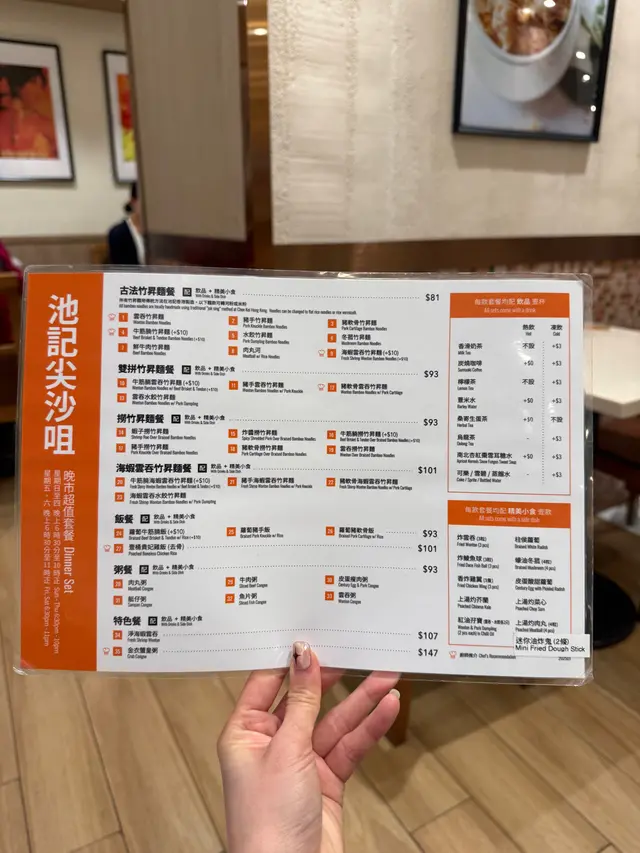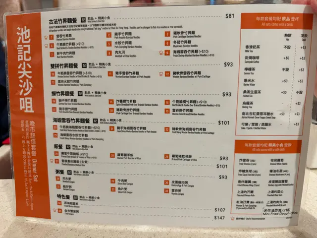 第四間竹昇麵係池記池記十幾年前係屋企附近商場食過一次覺得連鎖餐廳又貴又細碗唔係粱家權個廣告都唔知原來池記而係用自家手打竹昇麵仲請左以前好旺角d老師傅黎打麵同煮麵睇得出應該係有心做而家執淨尖沙咀一間可以選擇個位係海防道轉入去既樂道又係一個星期六既夜晚六點幾走過黎都仲未洗排隊可以直入門口有辣椒油同蝦子賣入面算大間同幾full既唔只有支那人韓國菲律賓乜都有總之都係遊客為主一個人可以坐張二人檯未有人等位果時都仲未洗搭檯住不過臨走果時七點鐘就有人過黎搭檯我前面仲有張單人檯檯面筷子有蓋好同埋側邊有調味料雖然係遊客點但正常單點餐牌就得中文字蝦籽撈麵58雙拼都係加10蚊當係比坤記貴些少但係尖沙咀嘛算係比較正常既價位遊客睇有英文字版本就要跟set同我以前既感想一樣都幾貴餐牌無寫雙拼有蝦籽雲吞撈麵不過落單話可以價錢一樣就唔知可唔可以三拼呢間店都係無水提供所以坤記算係咁仲要等廿分鐘先上菜蝦子份量少就咁望同食都幾單調隻麵就同坤記差唔多唔夠爽不過碗湯都有成羹蝦子唔知點解幾間個湯都只係微溫我記得第一次係好旺角食撈麵係好好好熱既而個湯飲落好重好濃唔會口渴個味係四間入面最出最好飲雲吞有四粒呢份係普通雲吞蝦肉咬落係比較爛既唔知海蝦既分別大唔大雖然算係集團但唔收信用卡前面遊客都要拎現金黎比但都收八達通呢個麵68蚊價錢同劉森記麵麵棧一樣但少個餸不過佢係尖沙咀區無加一都算係咁舖頭算大間始終都係集團式營運侍應人手都多都仲係人手落單服務就一般正常不過後面有位阿姐落單問左一堆野個侍應都仲未炸型算係咁但並唔係熱情既個麵唔係差始終有老師傅座陣但都係果句集團式營運食物好似都係要就住咁整唔算渣流灘但都唔係點樣抵食既野中規中矩…查看更多