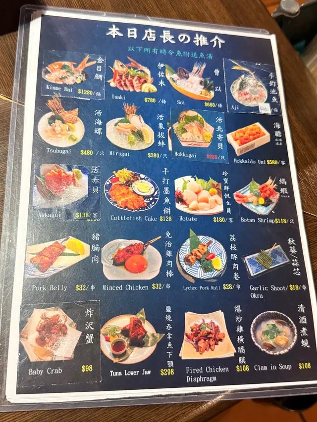 這間小店在尖沙咀都很久了,人氣依舊,一定有他的原因在的!而我覺得這裡吸引的地方,就肯定是食材的新鮮,亦是日本菜主打的原因,更深的原因就是性價比真的不錯。前菜(20元)今天是甜辣的蜆肉,味道清爽,蜆肉鮮甜。沃川刺身拼盤(上)(498元)很豐富的拼盤,一共有八款不同的刺身,分別有魷魚,帆立貝,八爪魚,三文魚,油甘魚腩,劍魚腩,牡丹蝦,酒盜芝士配吞拿魚赤身。刺身都非常新鮮,而且很有驚喜的,特別是八爪魚,跟普通的天差地別,口感特別脆嫩。油甘魚腩鮮甜嫩滑又有油香。劍魚腩口感帶點脆,但油脂挺足的。牡丹蝦特別香甜,口感軟糯。更有特別搭配酒盜芝士配吞拿魚赤身,味道濃厚鹹香,芝士香滑,赤身魚味突出,吃的時候用紫菜包著來吃,味道更香。鱈魚乾(48元)口感酥脆,有魚香。牛舌芯(38元)燒得焦嫩的厚切牛舌,吃起來肉嫩多汁,油脂豐富,牛肉味濃。雞蠔(32元)雞蠔即是雞上脾的那一小部份肉,雞肉味會比較濃香,而已肉質嫩滑又有彈性,吃起來肉汁豐富,燒得焦香。雞腳筋串(28元)口感非常爽脆,又帶點雞的油脂香,而且燒得剛好,不會太乾。蒜芯(18元)只用上最脆嫩的部位,口感非常脆嫩,味道清甜,加了七味粉來調味,有點辣。鹽燒鵪鶉脾(2隻)挺特別的,比較少見,肉質非常嫩滑,比雞腿更嫩,有肉汁。炸豬肉餃子(68元)炸得非常香脆,但餃子還保留到肉汁,中間是菜肉餡料,味道帶點甜。五目炒什菜(78元)新鮮炒起,熱辣辣的,加上大量的木魚碎增加鮮味,什菜炒得有鍋氣,口感脆嫩。蒲燒鰻魚飯(148元)鰻魚給的是肥美的前段,吃起來入口即化,魚香十足,配上彈牙的珍珠米,特別下飯。…查看更多