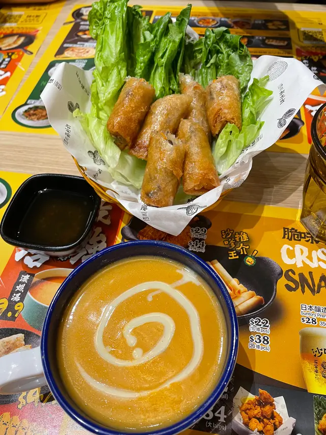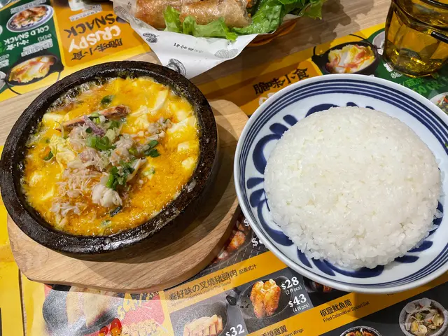 一入坐看看餐牌,就被那色彩鮮艷的二人餐牌吸引,有前菜,小食,主食,飲品還有雪糕,好豐富!所以決定叫一個二人餐加多兩個主食。🎐煙肉上湯娃娃菜🥬前菜之一,白烚娃娃菜,普通。🎐濃蝦湯🫕前菜之一,只係濃蝦不是龍蝦湯,湯稠度偏稀。🎐越南脆皮春卷🌯小食只可選擇一款,意外覺得份量唔少,而且又脆又好味。🎐沙嗲牛肩胛粉絲🍜份量偏細少,沙嗲湯底濃郁。🎐蟹粉豆腐鍋配飯蟹肉好足,豆腐好滑,略嫌入口口感唔夠滑溜,帶乾,但味道唔錯。🎐慢煮豬軟骨飯配半隻糖心蛋豬軟骨好味,肉質好腍,大大舊都唔會膩。🎐紅酒牛扒汁配芝士焗牛柳粒飯(炒飯底)牛柳粒肉質嫩,芝士份量適中,炒飯粒粒分明。🎐芒果椰汁沙冰配寒天波波好好飲,滿滿芒果蓉及芒果肉,口感豐富。🎐菠蘿碧海普通梳打汽水飲料。:)好豐富的二人餐,而且甜品有Häagen-Dazs雪糕,好值得試下。查看更多