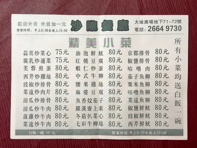 #20250701 🤍📍 #沙隴餐廳 大埔安泰路1號大埔廣場地下71-72號舖➖➖➖➖➖➖➖➖➖➖➖➖➖➖➖➖➖#快餐D #茄汁豬扒飯 $48 🥢 #炒底 +$12💭 呢間野有強勁,幫襯左廿幾年個餐牌都無轉過,每次尼都會叫D餐,雖然炒底要加$12望落真係幾多,不過加埋其實都係$60,同平時茶記價錢差唔多啦,但佢個炒飯真係粒粒乾身,撈茄汁勁好味,略嫌豬扒既份量有啲少,靠食飯飽🥫.#干炒沙嗲豬扒河 $58💭 茶記有樣特色就係你未必一定要叫餐牌上面既野,可以自己mix & match,只要伙記說有就有,呢度做既乾炒沙嗲好惹味,而且豬扒有好多塊,如果食乾炒牛河食到厭不妨試下呢個😏.#腐乳通菜 $26💭 又係每次尼既必食item,咁大個人食過咁多間唔同舖頭既腐乳通菜,暫時都仲未搵到間可以有呢度既咁岩口味,如果佢呢個腐乳醬出一樽咁賣應該有得諗🧐. 🥢 #凍檸茶 +$1💭 係快餐包埋既野飲,凍飲都只不過加$1,叫左少冰少甜,無錯香港人就係咁麻煩😂即叫即沖,上枱果陣個茶底仲係熱,啲冰眨下眼就溶晒,少甜所以會飲到茶既澀味,原來都幾濃因為當晚已經失眠喇🥤.#大埔美食 #🐷在大埔 #🐷_食 …查看更多