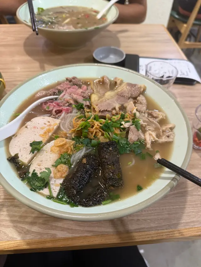 喺公司加班成九點先收工,喺橫街發現呢一間越越南菜舖頭,仍然坐滿客人。就決定買外賣回家,食物賣相吸引,估唔到味道亦都非常不錯。✨極品牛三寶湯河 ✨湯底清而不淡,味道非常濃郁,帶有地道越式香料香氣👍🏻👍🏻。生牛肉鮮嫩紅潤,口感滑嫩多汁,牛展軟腍,牛丸彈牙,配以軟滑的河粉整體層次豐富,是必點招牌。✨越式河內三寶飯✨內含煎得金黃香脆的豬扒、雞翼及扎肉,口感多變且非常滋味。豬扒厚身入味,搭配粒粒分明的白飯,香氣撲鼻,令人回味無窮。✨越式香濃咖喱牛腩飯✨咖喱醬汁色澤金黃鮮亮,香氣濃郁帶微辣,牛腩肉質軟稔入味,惹味得嚟非常送飯。✨越式手打蝦餅✨外層炸得酥脆,咬下去啖啖肉,彈牙又不會太油膩。✨越式豬頸肉✨豬頸肉燒得焦香誘人,肉質嫩滑且多汁,配搭酸甜酸辣的調味汁,非常惹味,風味十足。食物風味十足,菜式選擇非常多,價錢合理,難怪如此受歡迎👏🏻👏🏻 想睇更多介紹,馬上Follow我啦😁。 #河內越式料理 #越南菜#big_big_foodie #big_big_foodie食勻尖沙咀 #big_big_foodie食勻香港 …查看更多