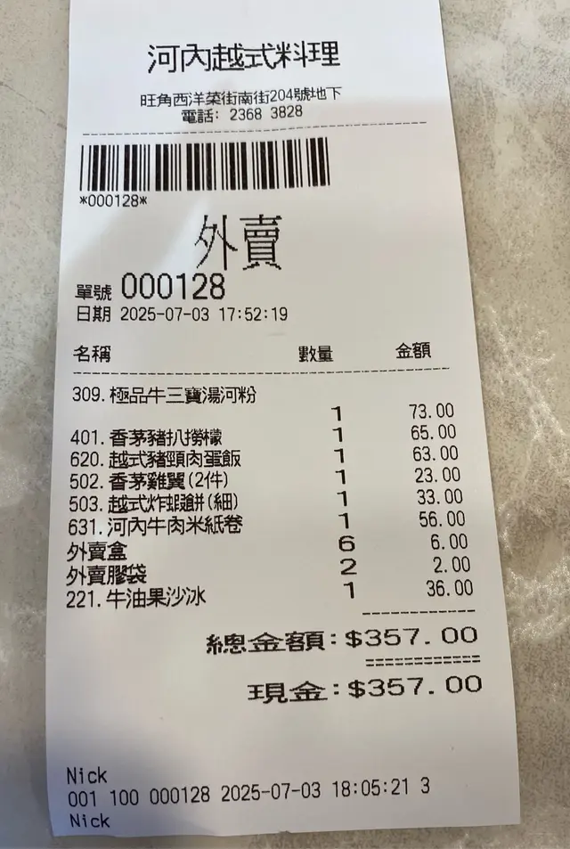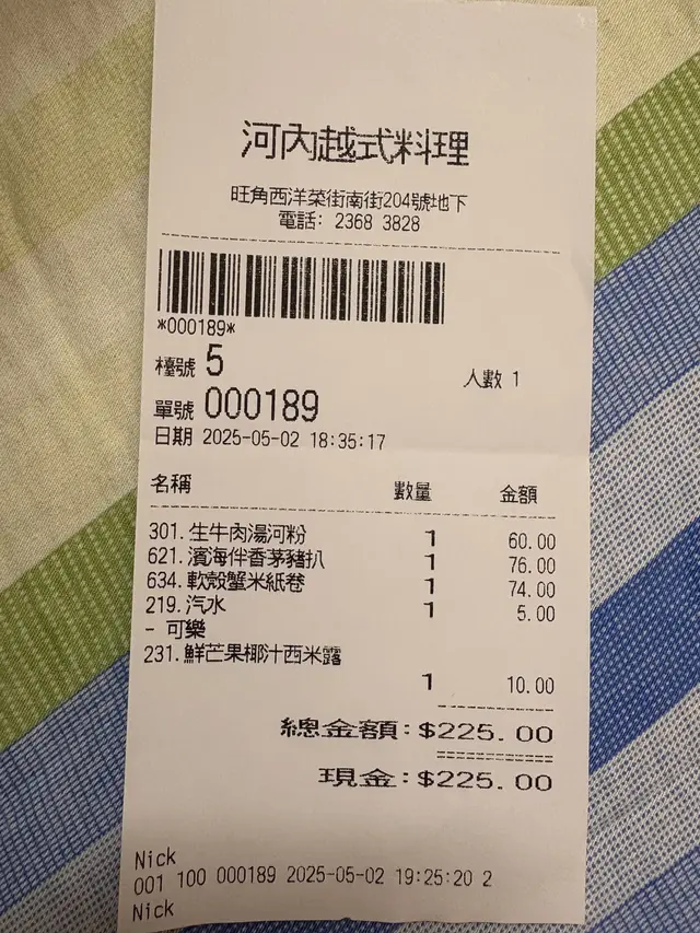 河內越式料理 (西洋菜南街) (旺角) 網址: https://s.openrice.com/QrbS0yzx2W0 地址: 香港旺角西洋菜南街204號地舖 電話: +852 23683828
