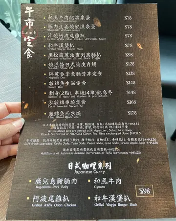 日式串燒 / 前菜,沙律,煮物料理,甜品 / 清酒,威士忌,紅酒,白酒,燒酌,梅酒 / 特色無酒精飲品特色有酒精飲品