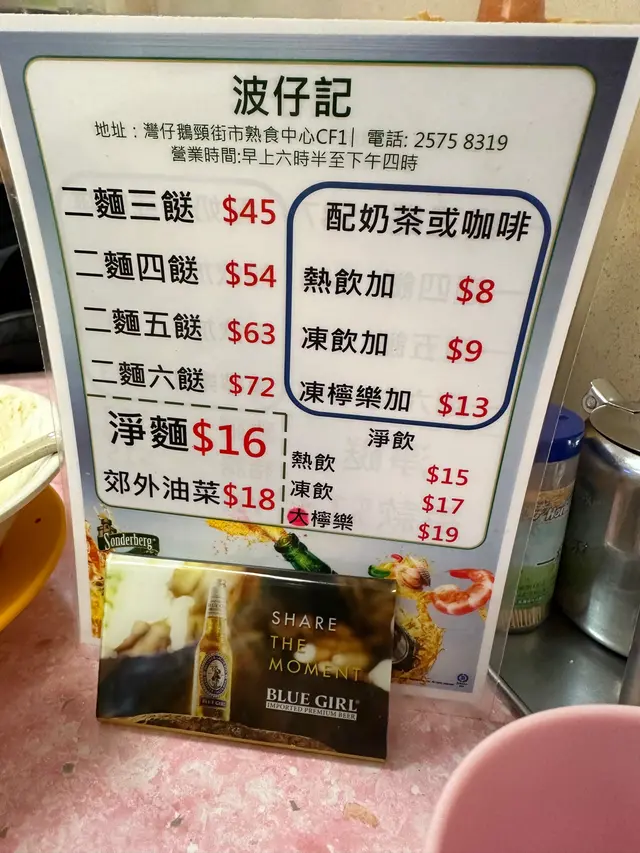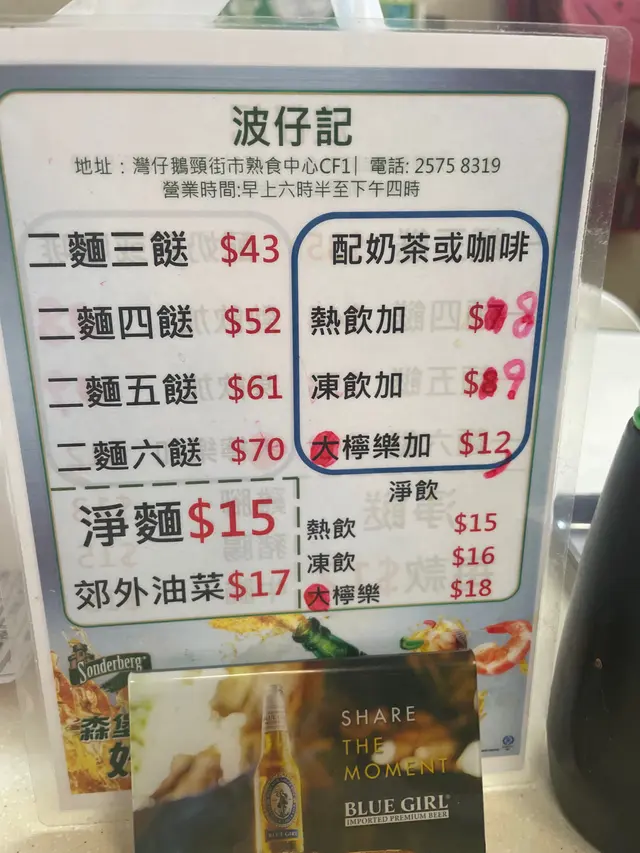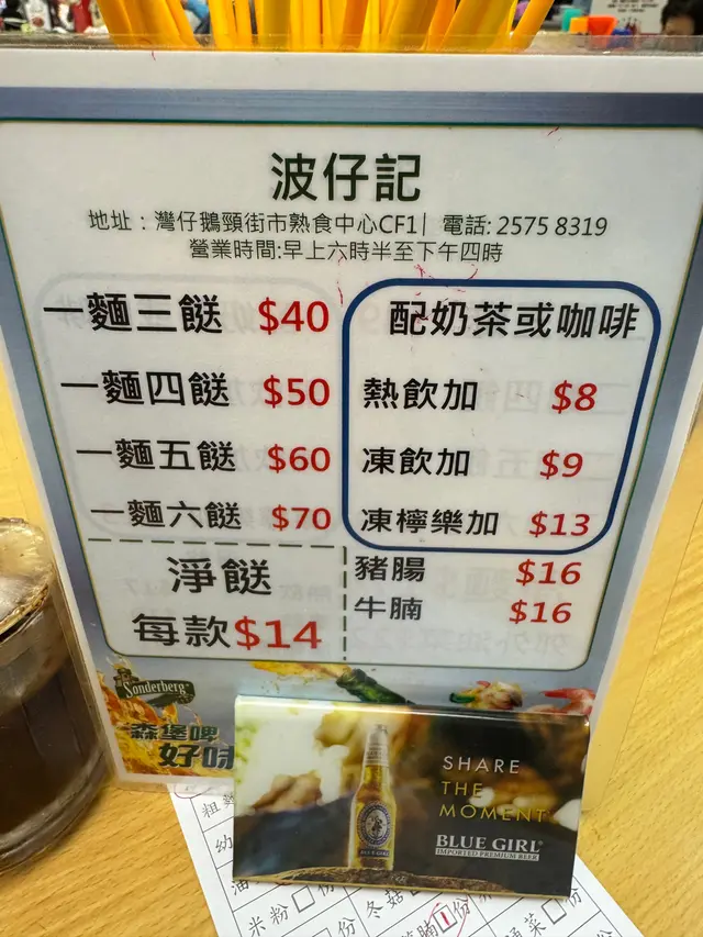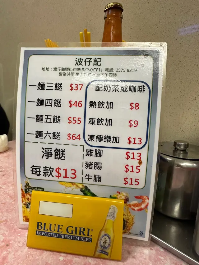 波仔記車仔麵 (灣仔) 網址: https://s.openrice.com/QrbS0kZG000 地址: 香港灣仔寶靈頓道21號鵝頸街市1樓鵝頸熟食中心CF1號舖 電話: +852 25758319