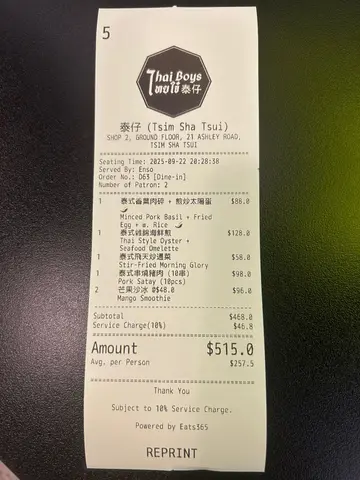 # 🇹🇭 【食評】尖沙咀《泰仔 Thai Boys》——天花板級泰菜滋味🔥 今日同老婆行到尖沙咀Ashley Road,心血來潮諗試新開嘅呢間泰菜店《泰仔 Thai Boys》。一入門口已經俾嗰股濃厚泰式氣氛吸引—— 店內裝修好新淨,牆身有啲色彩繽紛又地道feel嘅泰國poster,少少hipster味但唔浮誇,環境整體光亮乾淨。 最加分嘅係店員全部都係泰國人,講英文加啲泰式口音英文,好親切,感覺真係有少少坐喺曼谷街邊食檔咁既錯覺。 ---## 🥢 主菜篇 ### 🐄 和牛炒河($118)講真,呢碟和牛炒河係成餐嘅靈魂。 一上枱嗰下已經聞到陣陣鑊氣撲鼻,炒河用嘅醬汁鹹香帶少少辣味,個味層次好豐富。河粉啜晒汁又唔爛,炒得夠乾爽; 重點係個「和牛」👍🏼——肉嫩得嚟仲好juicy,啲油香滲晒入去啲河粉入面,啖啖滿足。 真係想講一句:**泰式炒河嘅天花板!** ---### 🦀 蟹肉炒飯($138) 飯炒得金黃,每粒飯都分明乾爽,冇油笠笠嗰種感覺。 蟹肉份量勁多,唔係得啲碎屑,而係真‧蟹肉啖啖肉; 配上佢隨碟附送嘅青檸同魚露辣椒汁,一啖蟹肉一啖飯,加埋少少青瓜片,香口得嚟又夠清新——食極都唔膩。 ---### 🐷 燒豬頸肉($68) 呢個都係驚喜之一!切得厚身啱啱好,每件都有靚油脂層,燒到外脆內嫩。 沾埋佢嗰個泰式酸辣汁,一齊食真係好惹味。 份量唔少,兩個人share啱啱好。 ---### 🦪 蠔餅($128) 一上枱個賣相就好吸引——煎蛋金黃色,表面啲蠔粒同魷魚又多又大粒! 個蛋煎到外脆內滑,帶微微焦香;配埋海鮮,真心勁正。 淋啲甜辣汁落去,酸甜平衡一流,好似瞬間穿越到曼谷夜市咁。 ---## 🥥 飲品篇 ### 椰汁沙冰($88) 呢杯真係超浮誇🤣 一大個椰青入面堆滿晒白雪雪嘅沙冰,賣相100分。 飲落超滑、清甜得嚟唔死甜,仲食到啲椰肉碎。兩個人share都飲唔晒,打卡又好味。 ---## 💬 總結感想 《泰仔 Thai Boys》呢間尖沙咀泰菜店真係有驚喜。 **食物水準高**:鑊氣十足、味道真材實料; **環境舒服**:新淨又有泰國風情; **服務態度好**:店員有禮又細心; **價錢中等偏實惠**:四道菜加飲品埋單$594(連加一),以尖沙咀嚟講非常合理。 ---### 🌟 推介指數:⭐⭐⭐⭐⭐(5星滿分) **必食推介**:和牛炒河+蟹肉炒飯+椰汁沙冰 **一句總結**: > 真材實料嘅泰式風味,唔洗飛曼谷都食到地道滋味!🔥 📍 **地址**:尖沙咀亞士厘道21號地下2號舖 ⏰ **營業時間**:12:00–15:00、18:00–22:30 🥣 下次會再黎試佢嘅泰式船麵!…查看更多