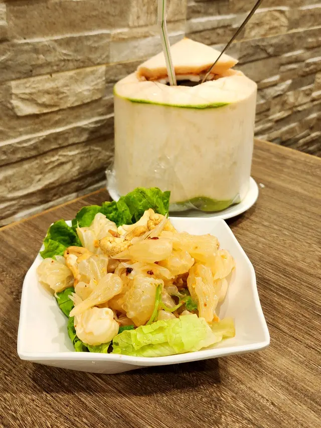 柚子沙律:柚子嘅味道就唔使講啦,醬汁有芝麻醬成份,加落去都唔會太奇怪喎,啱晒而家咁熱食。