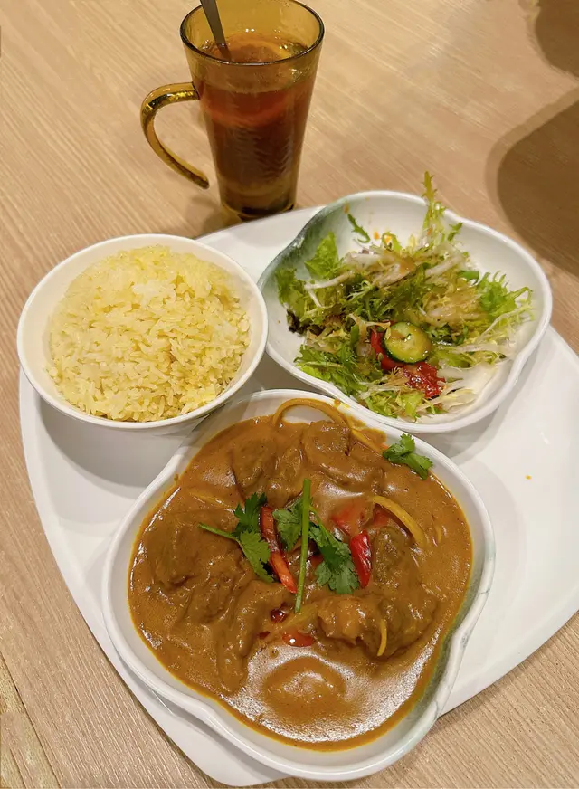 黃咖喱牛筋腩配雞油飯,送田園沙律