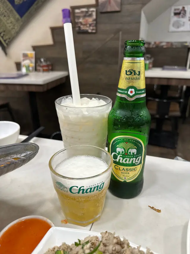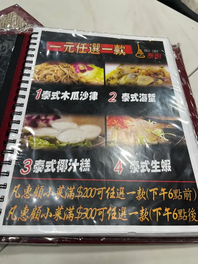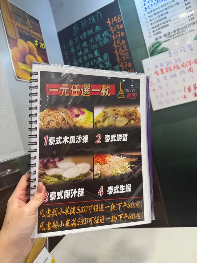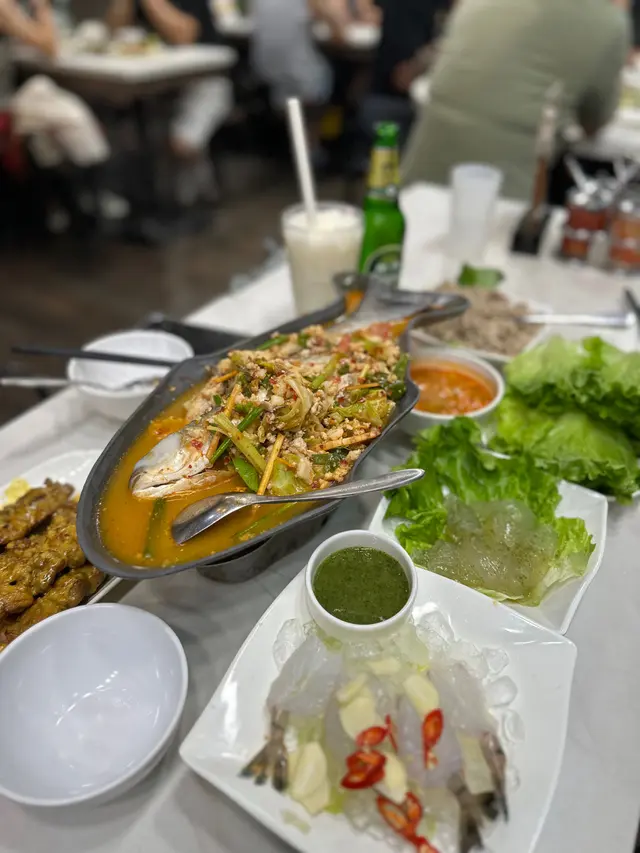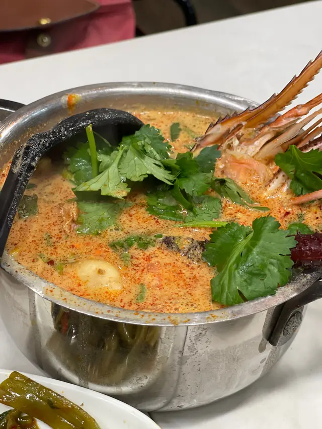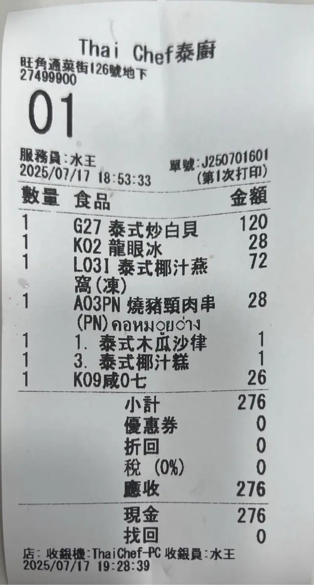就在金魚街的一間泰國菜餐廳,不要看他店小小的,其實有兩層的,晚上人氣不錯,還有超划算的優惠,味道又不錯,難怪吸引到不少人。泰式海蜇(1元)消費滿300元就可以1元換購,還有4款可選,超高性價比!1元的份量也很足,味道酸辣帶點甜,海蜇鮮嫩彈牙。泰式孖寶B(238元)性價比不錯的套餐,出面有些餐廳單點一條烏頭都差不多要200元了,這裡還配了有炒飯!而且鳥頭的尺寸也不少,肉質嫩滑,吸飽酸酸辣辣的湯汁,特別惹味,配菜也很多。菠蘿海鮮炒飯料也很足,加了青口,蝦仁,魷魚,再配上大量的配料一起炒香,當然少不了香甜的菠蘿了,整體酸酸甜甜的,又有蛋香,海鮮味足。泰式咖哩海蝦(114元)很有驚喜,滿滿的海蝦,口感爽滑彈牙,而且開背了,蝦肉包裹了滿滿的咖哩汁,特別惹味。咖哩的味道香濃,帶甜味,亦有很濃的蛋香,非常下飯或配薄餅。薄餅(42元)薄餅吃起來感覺不是平常的預製菜,口感特別酥脆,味道挺香的。泰式香茅雞翼(19元)燒豬串(18元)燒雞串(18元)串燒賣相不錯,上面加了大量的沙嗲汁,味道特別香濃,帶點微辣,非常惹味!雞翼燒得焦香有肉汁。豬肉用的是梅頭肉,較嫩滑。雞串是雞腿肉,有彈性又多汁。椰青(44元)大大個椰青,味道清甜,喝完最後再吃椰肉就最好了。…查看更多
