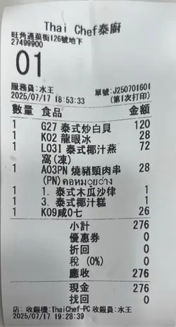 突如其來的空檔可以跟男友吃個午飯,加上我倆也太久沒吃泰國菜,於是就找來旺角一間有口碑又正宗的泰國餐廳來吃一頓豐盛午餐 泰式炒白貝 $178第一款選來店家推薦的招牌菜式之一:泰式炒白貝!白貝較平常吃到的蜆大隻,非常新鮮而且事前處理得很好沒吃到半粒沙子;份量也是相當多啊!肉質爽彈,白貝肉大點吃起來就更有口感~ 醬汁方面是偏甜的香辣味道,辣勁較為溫和帶濃郁的九層塔香氣,是很容易讓人接受的辣度啊!和牛 $28/串豬頸肉 $28/串吃泰菜怎能缺少串燒呢?這次就選了和牛跟豬頸肉兩款,充滿炭香的味道呀~ 兩款都燒得剛剛好,和牛腍滑有油香,配泰式青醬味道清新減膩;豬頸肉就燒到表面微焦略脆,肥瘦相間咬起來夠香口,搭配秘製花生沙嗲醬真的超惹味好吃!馬拉盞炒椰菜苗 $80差不多每次吃泰菜都要吃的馬拉盞炒菜,店家這裡的炒菜組合無論是香料還是蔬菜類別多得餐單佔上接近一整頁,不吃馬拉盞的也可以選其他口味啊!而這次就不吃通菜改為吃椰菜苗,馬拉盞用得夠多味道濃郁惹味,跟炒白貝有點類似但又香辣感會重一點,口感方面椰菜苗就相對爽口也會帶點甘澀味道泰式蝦膏炒飯 $69前幾款都是有不少惹味醬汁烹調而成的菜餚,總覺得欠缺什麼似的來個炒飯就可以拌醬汁吃~ 店家有蝦醬或蝦膏炒飯而我們選了後者貪其香味更濃!炒飯超有鑊氣,蝦膏的鹹香跟櫻花蝦的鮮味令炒飯生色不少;加上用料不少還有幾隻大蝦令口感相當豐富超好吃!再配其他餸菜的醬汁又成另一種風味也是好吃~泰式椰青 $44椰汁冰 $28自己每次吃泰菜都會喝椰青~ 這裡的椰青超大個又夠冰凍,清甜可口可以解辣!男友就選來冰凍的椰汁冰,甜度剛好,椰奶味非常重夠香夠濃芒果糯米飯 $68泰國甜品必食「國民級」的芒果糯米飯啦!店家是用上原個芒果,果肉香甜,再配暖暖軟糯糯米和椰漿,超級大滿足精選小菜( 泰式生蝦/ 泰式海蜇/ 泰式椰汁糕/ 泰式木瓜沙律) $1[ 下午六時前惠顧小菜滿$200可任選一款 ][ 下午六時後惠顧小菜滿$300可任選一款 ]最近店家推出性價比超高優惠,就是消費滿指定金額就可以用$1 加購一款精選小菜,四款小菜有泰式生蝦、泰式海蜇、泰式椰汁糕跟泰式木瓜沙律~ 試了泰式海蜇和泰式椰汁糕,兩款都超好吃!跟平常吃的條狀完全不同,這裡的泰式海蜇是一小口的非常爽脆Q彈,就像在吃有𡁻勁的啫喱般,搭配泰式生蝦的醬汁,微酸辣勁開胃!至於椰汁糕就非常抵食,$1就有4個啊!椰汁糕入口軟滑,上層是幼滑的椰汁香氣,下層就是煮得軟糯綿密、混入粟米粒的西米糕,口感豐富甜度剛好,愛吃椰香的一定很喜歡~店家位於旺角女人街,天橋出口直達非常便捷;開業已經十多年,充滿泰國風情,看起來比較細小但有兩層高!食物質素很高,問過店員才知道這裡由泰國師傅主理,而且堅持用上正宗的泰國香料和食材等製作,選料講究做出地道的泰國料理~ 而且價廉物美每樣餸菜都大大份,店員非常熱情地推薦美食,還有不少套餐選擇和有優惠,大伙兒來吃就可以多試幾款查看更多
