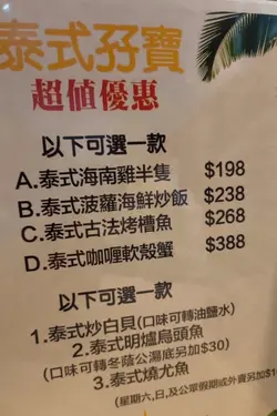 今晚係旺角行完街食晚飯, 夏天又熱熱地, 食泰國菜岩哂, 同朋友黎呢間泰國菜館開餐, 睇完餐牌, 佢既價錢真係好親民,我地揀左泰式孖寶套餐都係只需$198, 同埋於指定時段消費滿指定金額, 就可以以一元優惠價加購小菜,凡惠顧小菜滿$200可四選一款(下午六點前),或者凡惠顧小菜滿$300可四選一款(下午六點後), 超讚!*泰式海蜇店員介紹呢度既海蜇比較特別, 唔係間間有, 的確係, 食落口感爽脆, 好Q, 小小微辣, 十分開胃既前菜*泰式生蝦生蝦當然唔小得要點埋佢既泰式辣醬汁啦, 配埋辣椒蒜片一齊食, 刺激味蕾, 生蝦又爽彈*泰式海南雞(半隻)雞肉份量都幾多吓, 雞肉嫩滑有雞味, 配搭埋泰式醬汁一齊食,好滋味*明爐烏頭熱辣辣送上, 下面有蠟燭可以保溫, 魚肉滑溜, 加埋酸酸地既湯汁一齊, 送飯一流*馬拉盞炒通菜通菜炒馬拉盞醬汁絕配, 無得輸, 辣辣地好惹味。*椰青 ~ 椰青真係好大個, 飲極都有, 清甜可口夠哂凍,夏天飲好爽, 又可以食埋椰肉*椰汁冰 ~ 好冰涼,夏天要飲查看更多