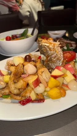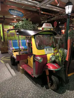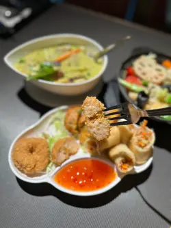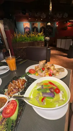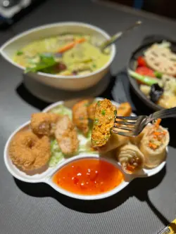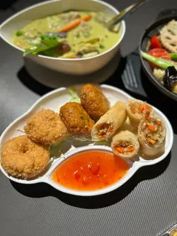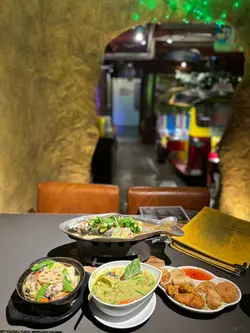 餐廳無論環境同食物都落足心思,打卡一流而且套餐經濟實惠。全間餐廳用咗大量綠葉同樹木做裝飾,真係有種置身於泰國森林嘅感覺。最特別係餐廳中間放咗一部泰國地道嘅「嘟嘟車」,同埋有一個仿山洞設計嘅座位區,創意十足。晚市時段有幾款套餐選擇,價錢合理。今次試咗個「泰滋味自選套餐」,可以自由揀三樣餸。🥢泰式拼盤 (炸蝦餅、魚餅、春卷)炸物炸得金黃。蝦餅彈牙,魚餅香茅味夠突出,春卷就夠脆口,餡料足。🥢明爐青檸烏頭原條烏頭魚上枱,用傳統泰式明爐保持住溫度,熱辣辣。魚肉鮮嫩,完全冇泥味,吸收晒青檸、香茅同泰式香料嘅酸香湯汁,非常開胃。🥢青咖喱雞青咖喱汁做得唔錯,椰香味濃,香滑得嚟唔會太膩,辣度溫和。雞肉份量足,夠嫩滑。🥢雜菜粉絲煲 (散叫)粉絲煲鑊氣夠,粉絲索晒醬汁同雜菜嘅甜味,味道不錯。雜菜種類都算多,有椰菜、菇類、菜心等,口感豐富。🌟環境裝修別出心裁,打卡度滿分;食物整體水準不錯,尤其明爐烏頭值得一試。晚市套餐定價合理,喺銅鑼灣區來講性價比高。…查看更多