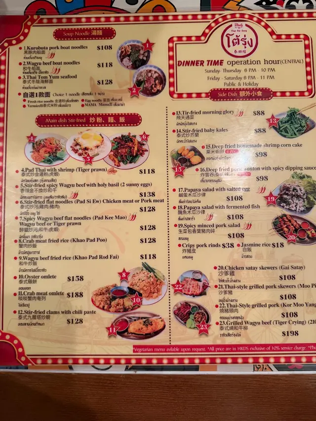 呢間 Thai Pai Dong 🇹🇭 真係中環必試嘅泰菜店,平日中午都有人排隊,難怪好多人都話佢有米芝蓮潛質✨。餐廳主打船麵同多款街頭小食🍢,最勁係九成食材都係由泰國直送,地道味滿分!🐔 沙嗲雞串一上枱就聞到碳烤香味🔥,真係香到忍唔住立刻開動!雞肉外脆內嫩、肉汁飽滿,嗲醬香濃滑順,花生味唔會太重,甜中帶鹹,越食越香。每啖都有炭香加上微微焦香,好似喺曼谷街頭現烤出嚟咁,推介指數💯!🍜 和牛船麵湯底色澤深但清澈,香料味濃郁,飲落微酸微甜好開胃。和牛片軟腍入味、仍保粉嫩色澤🐮,炸豬皮同肉丸增加咬口,一碗入面層次好豐富。每啖都食得出湯頭心機,真心唔輸泰國當地!🔥 醉貓炒河呢碟真係鑊氣爆棚🔥!寬粉煙韌滑身,炒得乾身入味,每條粉都吸晒醬汁精華。蝦肉爽彈🦐,配料有洋蔥、紅椒、芥蘭、蛋等,辣味香而唔嗆,炒得香口又惹味。醬香、蒜香、蛋香全部黏住粉條,越食越停唔到口,超正!💥🥬 飛天通菜通菜翠綠爽脆,蒜香超濃郁🧄,加上微辣調味,簡單但好有水準,完全係泰國街頭風味。🥭 芒果糯米飯芒果香甜多汁、糯米軟糯香滑,椰漿濃郁但唔膩,配上脆豆添層次,一啖糯米一啖芒果,好滿足~💕🧋 泰奶+龍眼冰泰奶香濃順滑、甜度啱啱好;龍眼茶帶淡淡果香🍯,清涼解膩,係完美收尾。😋 總結:味道正宗又細緻,食材高質又新鮮。沙嗲串碳香爆棚🔥、辣炒河粉鑊氣十足💨,每樣都好有驚喜!價錢以中環嚟講合理(約$500/2人),環境舒服又有街頭感。下次一定會再返嚟試多幾款~🇹🇭✨…查看更多
