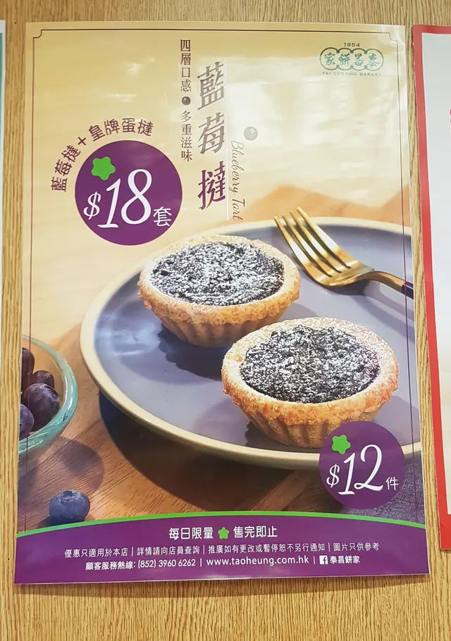 Tai Cheong Bakery has several branches. They sell Hong Kong pastry like egg tarts, pineapple bun or egg rolls to just name a few. It become famous for the last Governor of Hong Kong, Honorable Chris Patten, going in and out.We got two egg tarts, one cookie crust and the other one puff pastry. The puff pastry almost fall apart while taking it out of the Aluminium mould, which can be a sign for its freshness. The taste was quite normal, basic standard of Hong Kong egg tart. The custard was thick and not liquid.:)The pastry + coffee or milk deal was good and saves you some $…查看更多